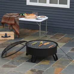 Outsunny Brasero Exterior Ø76×49,5 Cm 2 EN 1 Profundidad Del Cuenco 18 Cm Con Rejilla De Cocina Parrilla Para Barbacoa Calefacción Tapa De Malla Atizador De Fuego Para Patio Jardín Negro