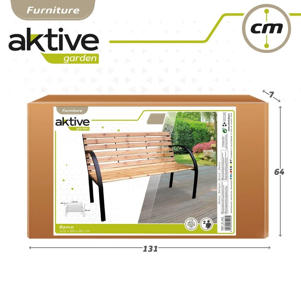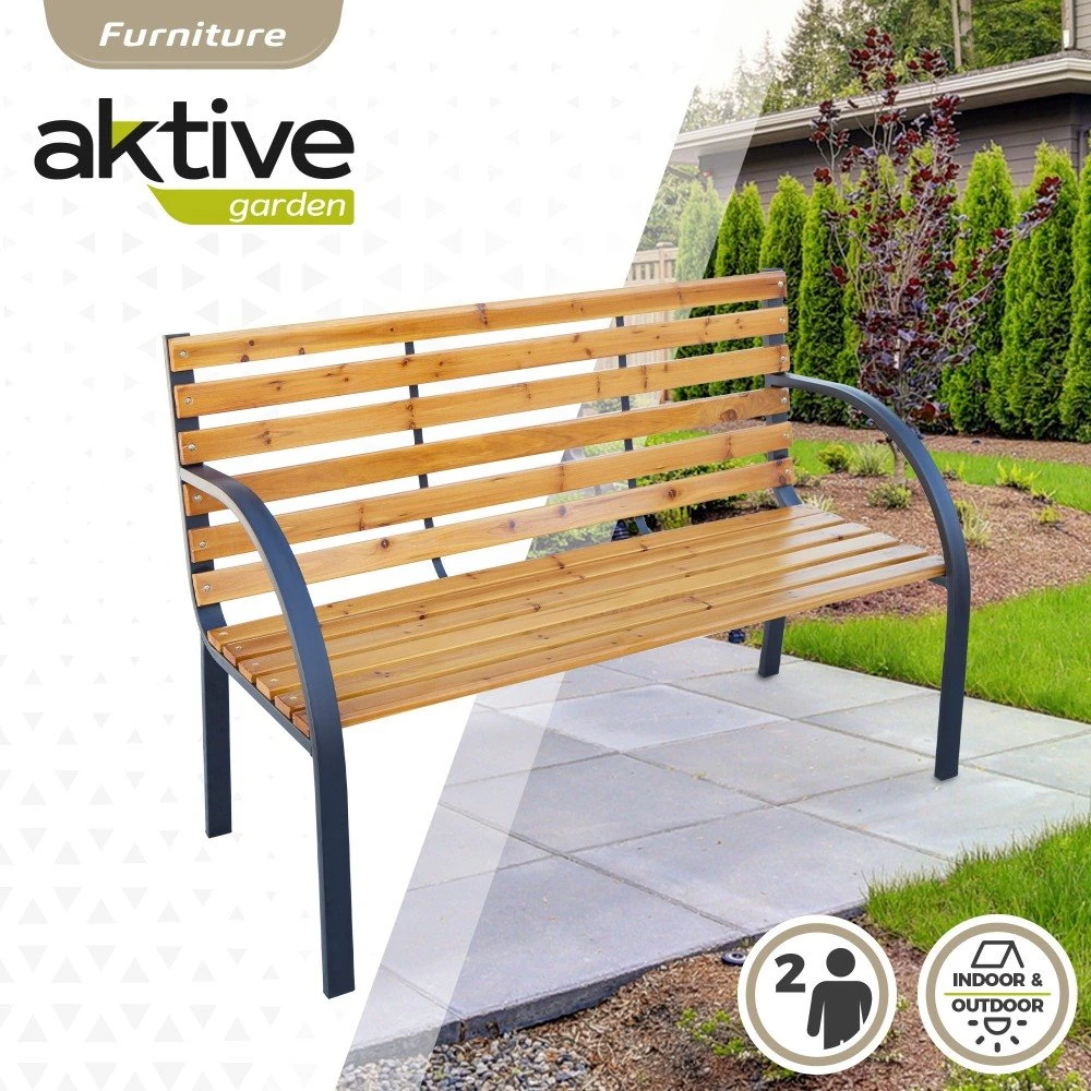 Este banco para jardín de madera de Aktive Garden es ideal para colocar en jardines, terrazas o patios y disfrutar de momentos únicos al exterior. Cuenta con un diseño clásico compuesto de listones con reposabrazos laterales, fácil de combinar con el resto de elementos de la terraza o jardín. Su asiento y respaldo están fabricados de madera color claro y su estructura de acero color negro. Tiene unas medidas de 122 cm de ancho, 52,5 cm de largo y 82 cm de alto y capacidad para sentarse hasta dos personas con un peso máximo soportado de 220 kg. El banco pesa 9 kg, se puede lavar con facilidad con un paño húmedo y requiere de poco mantenimiento.