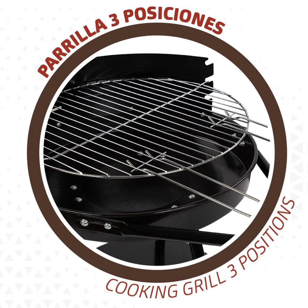 - Incluye: asa de transporte, dos ruedas para transportarla, parrilla con dos mangos extraíbles y base metálica inferior auxiliar