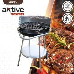 Barbacoa de carbón redonda portátil Aktive. Fabricada en metal esmaltado en color negro y gris con unas medidas montada de Ø51×82 cm. Con estructura metálica de cuatro patas con dos ruedas y superficie auxiliar. Cuenta con doble parrilla, dos mangos extraíbles y 4 alturas para colocar la parrilla más o menos cerca de las brasas. De poco peso y con asa de transporte en la parte delantera para mover cómodamente. Montaje fácil y rápido (se necesitan herramientas.