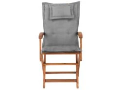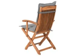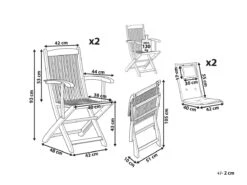 Conjunto de dos clásicas sillas de jardín con cojín. La silla de jardín con reposabrazos será una pieza llamativa en cualquier jardín o patio trasero. Es resistente y de fácil mantenimiento. La silla está elaborada en madera de acacia en un precioso tono cálido. Los reposabrazos garantizan el máximo confort al sentarse. Además, las sillas están equipadas con cómodos y gruesos cojines. El material de los cojines es impermeable, por lo tanto es fácil de limpiar. La funda no tiene cremallera. El mecanismo de plegado te ayudará a ahorrar una gran cantidad de espacio. Detalles: Tipo de Producto: Silla de jardín Estilo: Rústico Color: Madera clara Tipo de material: Madera maciza Material principal: Madera de acacia Material adicional: Poliéster Material de las patas: Madera maciza Material del asiento: Tejido Composición del Material: 100% Poliéster Apoyabrazo: Sí Acabado: Aceitado Plegable: Sí Densidad de espuma del asiento: 18 kg/m3 Apilable: No Dimensiones: Altura del apoyabrazos: 65 cm Profundidad: 48 cm Espesor del asiento: 5 cm Altura del asiento: 43 cm Ancho: 42 cm Altura: 93 cm Superficie del asiento: 40×38 cm Peso: 10 kg Capacidad de peso: 110 kg La oferta incluye: 2 x Silla, 2 x Cojines del asiento Ventajas: Las tiras ofrecen una fijación segura, Confort del asiento óptimo, Diseño atemporal, Materiales de la más alta calidad, Resistencia UV 5 (ISO 105-B02, Plegable para un fácil almacenamiento, Mantenimiento sencillo Información de montaje: No requiere montaje Información adicional: El producto viene con un libro de cuidados detallado para ayudarte a mantener tus muebles en las mejores condiciones durante muchos años. Consulta estos consejos para garantizar el mantenimiento adecuado de tus muebles nuevos – encontrarás las instrucciones de mantenimiento junto con el manual de montaje. Texto de resistencia: Gracias a su resistencia al agua, puedes utilizar el producto al aire libre y dejarlo a la intemperie durante lluvias ligeras. Si no es posible guardarlo en un lugar cerrado y protegido, recomendamos utilizar una funda protectora. La exposición prolongada a la humedad puede provocar daños en el mueble. Resistencia: Agua ligera / humedad Consejos de mantenimiento: Madera de acacia: 1.Limpiar con un limpiador suave y un paño suave en la dirección de la veta. Secar con un paño inmediatamente después de limpiar 2.Durante el invierno o en condiciones climáticas adversas, utilice una funda protectora o guarde los muebles en el interior 3.Los muebles con acabado de aceite deben volverse a engrasar antes de ponerlos en uso y al menos una vez al año, especialmente en el clima húmedo. Poliéster: 1.Aspire con un accesorio adecuado 2.Limpiar con champú seco y una esponja húmeda o un limpiador suave 3.Cuando no esté en uso, manténgalo en un lugar limpio y seco para protegerlo de las condiciones atmosféricas.