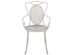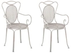 Conjunto de 2 sillas vintage. Este conjunto de sillas bistró de metal es perfecto para un pequeño balcón o terraza. Diseñado en un estilo delicado y único de inspiración romántica, presenta reposabrazos y patas bellamente curvados y se ve perfecto con una mesa similar. El aspecto desgastado y el acabado gris hacen que las sillas combinen con los cojines y mantas de exterior. Detalles: Tipo de Producto: Silla de jardín Estilo: Tradicional Color: Gris Tonalidad: Gris claro Tipo de material: Metal Material principal: Hierro Material de las patas: Metal Material del asiento: Metal Apoyabrazo: Sí Acabado: Revestimiento en polvo Plegable: No Apilable: No Dimensiones: Altura del apoyabrazos: 20 cm Profundidad: 43 cm Altura del asiento: 47 cm Ancho: 42 cm Altura: 94 cm Superficie del asiento: 42×42 cm Peso: 9 kg Capacidad de peso: 120 kg La oferta incluye: 2 x Silla Ventajas: Apariencia moderna y calidad durante muchos años, Construcción muy estable, Ideal para uso al aire libre, Resistente a las manchas, Fabricación sólida y precisa Información de montaje: Requiere montaje completo. 20-40 min. Información adicional: El efecto desgastado o las manchas visibles son intencionales y no se consideran un defecto. Texto de resistencia: Gracias a su resistencia al agua, puedes utilizar el producto al aire libre y dejarlo a la intemperie durante lluvias ligeras. Si no es posible guardarlo en un lugar cerrado y protegido, recomendamos utilizar una funda protectora. La exposición prolongada a la humedad puede provocar daños en el mueble. Resistencia: Agua ligera / humedad Consejos de mantenimiento: Metal: 1.Los muebles de acero y sus elementos no deben exponerse al agua. De lo contrario, existe la posibilidad de que el agua oxidada salga de las tuberías del marco 2.Cuando no estén en uso, los muebles deben guardarse en el interior o bajo una cubierta protectora 3.Para aumentar la durabilidad del artículo, manténgalo seco y recuerde la limpieza regular 4.Cualquier daño a la capa de pintura exterior debe protegerse de la humedad 5.Para garantizar la protección contra la corrosión, evite los limpiadores alcalinos o ácidos. Después de limpiar, secar bien 6.Quite las tapas protectoras con regularidad para que salga todo el líquido, déjelas secar y utilice un spray anticorrosión si es necesario 7.Limpiar con detergentes suaves.