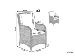 Juego de sillas de ratán sintético. Añade a tu zona exterior este conjunto de 2 sillas de jardín. Está fabricado a partir de ratán sintético de alta calidad. El respaldo acolchado y los cojines de asiento proporcionan la máxima comodidad. La estructura de aluminio resistente ofrece estabilidad. Combina bien con cualquier área contemporánea, tradicional o moderna. Detalles: Tipo de Producto: Silla de jardín Estilo: Moderno Color: Gris Tipo de material: Ratán sintético Material principal: Ratán sintético Material adicional: Poliéster Material de las patas: Mimbre sintético Material del asiento: Tejido Composición del Material: 100% Poliéster Apoyabrazo: Sí Acabado: Revestimiento en polvo Plegable: No Densidad de espuma del asiento: 28 kg/m3 Apilable: No Dimensiones: Altura del apoyabrazos: 64 cm Profundidad: 73 cm Espesor del asiento: 10 cm Altura del asiento: 38 cm Ancho: 60 cm Altura: 96 cm Superficie del asiento: 50×49 cm Peso: 10 kg Capacidad de peso: 100 kg La oferta incluye: 2 x Silla, 2 x Cojines del asiento, 2 x Cojín del respaldo Ventajas: Cojines muy cómodos para un confort ideal, Muy cómodo, Cómodos apoyabrazos, Diseño tradicional con un toque moderno, Muy fácil de conservar, Fabricación sólida y precisa, Resistencia UV 7 (ISO 105-B02, Patas con tapas antideslizantes de seguridad Información de montaje: No requiere montaje Texto de resistencia: Gracias a su resistencia al agua, puedes utilizar el producto al aire libre y dejarlo a la intemperie durante lluvias ligeras. Si no es posible guardarlo en un lugar cerrado y protegido, recomendamos utilizar una funda protectora. La exposición prolongada a la humedad puede provocar daños en el mueble. Resistencia: Agua ligera / humedad Consejos de mantenimiento: Ratán sintético: 1.Para alargar la vida útil del mueble, protéjalo de la exposición directa al sol 2.Se recomienda utilizar una funda protectora para la temporada de invierno o, si es posible, para mantener los muebles secos y frescos en el interior 3.Limpiar con detergentes a base de jabón. No utilizar limpiadores químicos corrosivos 4.Los utensilios o accesorios de vidrio pueden sobrecalentar la superficie. Poliéster: 1.No secar en secadora ni planchar 2.Lavar a mano únicamente, usar agua fría y un detergente suave 3.Cuando no esté en uso, manténgalo en un lugar limpio y seco para protegerlo de las condiciones atmosféricas.
