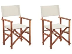Juego de sillas. Este conjunto de 2 sillas de jardín aporta un ambiente de Hollywood a cualquier sala de estar o área exterior. Están fabricadas de madera de acacia duradera y resistente con acabado natural que aporta un aspecto atemporal. El asiento y el respaldo de tela consiguen que las sillas parezcan sacadas directamente de un set de filmación. Son plegables, lo que facilita el almacenamiento. Detalles: Tipo de Producto: Silla de jardín Estilo: Retro Color: Madera oscura Tonalidad: Blanco crema Tipo de material: Tejido Material principal: Madera de acacia Material de las patas: Madera maciza Material del asiento: Tejido Composición del Material: 100% Poliéster Apoyabrazo: Sí Acabado: Aceitado Plegable: Sí Apilable: No Dimensiones: Altura del apoyabrazos: 64 cm Profundidad: 50 cm Altura del asiento: 48 cm Ancho: 50 cm Altura: 91 cm Superficie del asiento: 44×46 cm Peso: 4 kg Capacidad de peso: 120 kg La oferta incluye: 2 x Silla Ventajas: Diseño clásico, Ideal para todo tipo de decoración, Ideal para uso en interiores y exteriores, Resistencia UV 6 (ISO 105-B02, Plegable, ahorra espacio Información de montaje: Requiere montaje parcial. 20-40 min. Información adicional: Por favor, ten en cuenta que la madera es un producto natural, y cada pieza puede presentar ligeras variaciones. Las diferencias en el color o la textura, como las arrugas u otras características naturales, no se consideran un defecto ni tampoco una base de reclamación, El producto viene con un libro de cuidados detallado para ayudarte a mantener tus muebles en las mejores condiciones durante muchos años. Consulta estos consejos para garantizar el mantenimiento adecuado de tus muebles nuevos – encontrarás las instrucciones de mantenimiento junto con el manual de montaje. Texto de resistencia: Gracias a su resistencia al agua, puedes utilizar el producto al aire libre y dejarlo a la intemperie durante lluvias ligeras. Si no es posible guardarlo en un lugar cerrado y protegido, recomendamos utilizar una funda protectora. La exposición prolongada a la humedad puede provocar daños en el mueble. Resistencia: Agua ligera / humedad Consejos de mantenimiento: Madera de acacia: 1.Los muebles con acabado de aceite deben volverse a engrasar antes de ponerlos en uso y al menos una vez al año, especialmente en el clima húmedo 2.Limpiar con un limpiador suave y un paño suave en la dirección de la veta. Secar con un paño inmediatamente después de limpiar 3.Durante el invierno o en condiciones climáticas adversas, utilice una funda protectora o guarde los muebles en el interior. Poliéster: 1.Cuando no esté en uso, manténgalo en un lugar limpio y seco para protegerlo de las condiciones atmosféricas 2.Aspire con un accesorio adecuado 3.Limpiar con champú seco y una esponja húmeda o un limpiador suave.