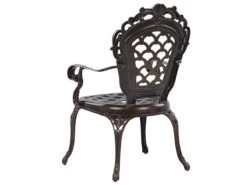 Conjunto de 2 sillas de jardín estilo vintage. Este conjunto de dos sillas clásicas y vintage enriquece cualquier área al aire libre con un acento elegante. Está hecho de aluminio duradero pero ligero y son fáciles de cuidar al mismo tiempo. Cuentan con líneas curvas, acabado marrón y patrones intrincados que les dan un aspecto elegante y exclusivo que embellece cualquier espacio. Las sillas vienen con cojines de asiento ricamente llenas para mayor comodidad. Detalles: Tipo de Producto: Silla de jardín Estilo: Retro Color: Marrón Tonalidad: Marrón oscuro Tipo de material: Metal Material principal: Aluminio Material adicional: Poliéster Material de las patas: Metal Material del asiento: Tejido Composición del Material: 100% Poliéster Apoyabrazo: Sí Acabado: Pulido Plegable: No Densidad de espuma del asiento: 28 kg/m3 Apilable: No Dimensiones: Altura del apoyabrazos: 29 cm Profundidad: 58 cm Espesor del asiento: 5 cm Altura del asiento: 33 cm Ancho: 69 cm Altura: 97 cm Superficie del asiento: 44×47 cm Peso: 11 kg Capacidad de peso: 150 kg La oferta incluye: 2 x Silla, 2 x Cojines del asiento Ventajas: Las tiras ofrecen una fijación segura, Estilo retro, Resistencia UV 4 (ISO 105-B05, Materiales de la más alta calidad, Mantenimiento sencillo Información de montaje: Requiere montaje completo. 45-60 min. Información adicional: El efecto desgastado o las manchas visibles son intencionales y no se consideran un defecto. Texto de resistencia: El producto es resistente al agua, lo que significa que no se dañará expuesto a la lluvia o en contacto con otros líquidos. Puede dejarlo al aire libre incluso durante fuertes lluvias o humedad. Durante la temporada de invierno es recomendable almacenar el producto en el interior o bajo una cubierta impermeable. Resistencia: Agua Consejos de mantenimiento: Aluminio: 1.Limpiar con agua jabonosa y detergentes suaves. Quitar el polvo con un paño suave 2.Fuera de temporada, utilice una funda protectora o guarde los muebles en un lugar fresco y seco. Poliéster: 1.Lavar a mano únicamente, usar agua fría y un detergente suave 2.Cuando no esté en uso, manténgalo en un lugar limpio y seco para protegerlo de las condiciones atmosféricas 3.No secar en secadora ni planchar.