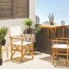Conjunto de dos clásicas sillas de jardín con cojín. La silla de jardín con reposabrazos será una pieza llamativa en cualquier jardín o patio trasero. Es resistente y de fácil mantenimiento. La silla está elaborada en madera de acacia en un precioso tono cálido. Los reposabrazos garantizan el máximo confort al sentarse. Además, las sillas están equipadas con cómodos y gruesos cojines. El material de los cojines es impermeable, por lo tanto es fácil de cuidar. La funda no tiene cremallera. El mecanismo de plegado te ayudará a ahorrar una gran cantidad de espacio. Detalles: Tipo de Producto: Silla de jardín Estilo: Tradicional Color: Madera clara Tonalidad: Blanco crema Tipo de material: Madera maciza Material principal: Madera de acacia Material adicional: Poliéster Material de las patas: Madera maciza Material del asiento: Tejido Composición del Material: 100% Poliéster Apoyabrazo: Sí Acabado: Aceitado Plegable: Sí Densidad de espuma del asiento: 18 kg/m3 Apilable: No Dimensiones: Altura del apoyabrazos: 65 cm Profundidad: 48 cm Espesor del asiento: 5 cm Altura del asiento: 43 cm Ancho: 42 cm Altura: 93 cm Superficie del asiento: 38×40 cm Peso: 9 kg Capacidad de peso: 130 kg La oferta incluye: 2 x Silla, 2 x Cojines del asiento Ventajas: Las tiras ofrecen una fijación segura, Confort del asiento óptimo, Diseño atemporal, Materiales de la más alta calidad, Resistencia UV 5 (ISO 105-B02 Información de montaje: No requiere montaje Información adicional: El producto viene con un libro de cuidados detallado para ayudarte a mantener tus muebles en las mejores condiciones durante muchos años. Consulta estos consejos para garantizar el mantenimiento adecuado de tus muebles nuevos – encontrarás las instrucciones de mantenimiento junto con el manual de montaje. Texto de resistencia: Gracias a su resistencia al agua, puedes utilizar el producto al aire libre y dejarlo a la intemperie durante lluvias ligeras. Si no es posible guardarlo en un lugar cerrado y protegido, recomendamos utilizar una funda protectora. La exposición prolongada a la humedad puede provocar daños en el mueble. Resistencia: Agua ligera / humedad Consejos de mantenimiento: Madera de acacia: 1.Los muebles con acabado de aceite deben volverse a engrasar antes de ponerlos en uso y al menos una vez al año, especialmente en el clima húmedo 2.Limpiar con un limpiador suave y un paño suave en la dirección de la veta. Secar con un paño inmediatamente después de limpiar 3.Durante el invierno o en condiciones climáticas adversas, utilice una funda protectora o guarde los muebles en el interior. Poliéster: 1.Cuando no esté en uso, manténgalo en un lugar limpio y seco para protegerlo de las condiciones atmosféricas 2.Aspire con un accesorio adecuado 3.Limpiar con champú seco y una esponja húmeda o un limpiador suave.