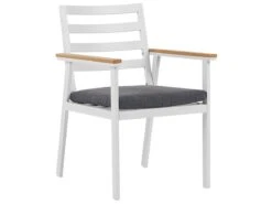 Juego de sillas de exterior. Disfruta de tu área de descanso al aire libre con este conjunto de 4 sillas de jardín. Están fabricadas a partir de aluminio con un recubrimiento en polvo para mayor durabilidad. El respaldo de listones aporta un toque escandinavo. Los reposabrazos están revestidos de madera sintética que protege del frío e introduce un poco de contraste. Incluye cojines de asiento a juego. Detalles: Tipo de Producto: Silla de jardín Estilo: Escandinavo Color: Blanco Tonalidad: Gris oscuro Tipo de material: Metal Material principal: Aluminio Material adicional: Madera plástica Material de las patas: Metal Material del asiento: Tejido Composición del Material: 100% Poliéster Apoyabrazo: Sí Acabado: Revestimiento en polvo Plegable: No Densidad de espuma del asiento: 14 kg/m3 Apilable: No Dimensiones: Altura del apoyabrazos: 63 cm Profundidad: 60 cm Espesor del asiento: 5 cm Altura del asiento: 40 cm Ancho: 54 cm Altura: 82 cm Superficie del asiento: 45×50 cm Peso: 5 kg Capacidad de peso: 150 kg La oferta incluye: 4 x Silla, 4 x Cojín del asiento Ventajas: Las tiras ofrecen una fijación segura, Cojines muy cómodos para un confort ideal, Estilo escandinavo minimalista, Robusto marco resistente a la corrosión, Resistencia UV 4 (ISO 105-B02, Patas con tapas anti-deslizantes Información de montaje: Requiere montaje completo. 45-60 min. Texto de resistencia: Gracias al acabado especial, la superficie del producto es resistente a la oxidación. Esto significa que se puede utilizar en exteriores. Cuando el producto no esté en uso, se recomienda cubrirlo con una cubierta o colocarlo en un lugar seco. Resistencia: Intemperie Consejos de mantenimiento: Aluminio: 1.Fuera de temporada, utilice una funda protectora o guarde los muebles en un lugar fresco y seco 2.Limpiar con agua jabonosa y detergentes suaves. Quitar el polvo con un paño suave. Poliéster: 1.No secar en secadora ni planchar 2.Lavar a mano únicamente, usar agua fría y un detergente suave 3.Cuando no esté en uso, manténgalo en un lugar limpio y seco para protegerlo de las condiciones atmosféricas.