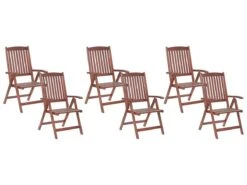 Sillas plegables para exteriores con respaldos ajustables. Agrega un toque de encanto campestre a tu jardín con estas elegantes sillas de inspiración rústica. Elaboradas de madera de acacia de alta calidad en un color marrón oscuro neutro, estas sillas complementan cualquier entorno al aire libre. La relajación también está garantizada gracias a los respaldos reclinables de las sillas que te permiten colocar estas piezas como desees y, para mayor comodidad, las sillas se pueden plegar para un fácil almacenamiento. Detalles: Tipo de Producto: Conjunto plegable Estilo: Rústico Color: Madera oscura Tonalidad: Rojo oscuro Tipo de material: Madera maciza Material principal: Madera de acacia Material adicional: Acero Material de las patas: Madera maciza Material del asiento: Madera maciza Apoyabrazo: Sí Acabado: Aceitado Plegable: Sí Apilable: No Dimensiones: Altura del apoyabrazos: 67 cm Profundidad: 69 cm Altura del asiento: 44 cm Ancho: 54 cm Altura: 105 cm Superficie del asiento: 48×43 cm Peso: 10 kg Capacidad de peso: 160 kg La oferta incluye: 6 x Silla Ventajas: Diseño atemporal, Combina con todo tipo de decoración, Apariencia moderna y calidad durante muchos años, Plegable, ahorra espacio, Materiales naturales, Respaldo ajustable Información de montaje: No requiere montaje Información adicional: Por favor, ten en cuenta que la madera es un producto natural, y cada pieza puede presentar ligeras variaciones. Las diferencias en el color o la textura, como las arrugas u otras características naturales, no se consideran un defecto ni tampoco una base de reclamación, El producto viene con un libro de cuidados detallado para ayudarte a mantener tus muebles en las mejores condiciones durante muchos años. Consulta estos consejos para garantizar el mantenimiento adecuado de tus muebles nuevos – encontrarás las instrucciones de mantenimiento junto con el manual de montaje. Texto de resistencia: Gracias a su resistencia al agua, puedes utilizar el producto al aire libre y dejarlo a la intemperie durante lluvias ligeras. Si no es posible guardarlo en un lugar cerrado y protegido, recomendamos utilizar una funda protectora. La exposición prolongada a la humedad puede provocar daños en el mueble. Resistencia: Agua ligera / humedad Consejos de mantenimiento: Madera de acacia: 1.Durante el invierno o en condiciones climáticas adversas, utilice una funda protectora o guarde los muebles en el interior 2.Los muebles con acabado de aceite deben volverse a engrasar antes de ponerlos en uso y al menos una vez al año, especialmente en el clima húmedo 3.Limpiar con un limpiador suave y un paño suave en la dirección de la veta. Secar con un paño inmediatamente después de limpiar.