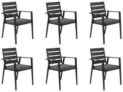 Juego de sillas de exterior. Añade elegancia a tu zona exterior con este conjunto de 6 sillas de jardín. Está fabricado a partir de metal duradero y de alta calidad. El respaldo de listones, el detalle de madera en los reposabrazos y las patas finas aportan un toque minimalista al diseño. Detalles: Tipo de Producto: Silla de jardín Estilo: Moderno Color: Negro Tipo de material: Tejido Material principal: Aluminio Material adicional: Poliéster Material de las patas: Material sintético Material del asiento: Tejido Composición del Material: 100% Poliéster Apoyabrazo: Sí Acabado: Revestimiento en polvo Plegable: No Densidad de espuma del asiento: 280 kg/m3 Apilable: Sí Dimensiones: Altura del apoyabrazos: 26 cm Profundidad: 58 cm Espesor del asiento: 5 cm Altura del asiento: 39 cm Ancho: 54 cm Altura: 86 cm Superficie del asiento: 43×43 cm Peso: 5 kg Capacidad de peso: 160 kg La oferta incluye: 6 x Silla, 6 x Cojines del asiento Ventajas: Funda extraíble, Perfecto para todo tipo de exterior, Construcción muy estable, Ideal para uso al aire libre, Patas con tapas antideslizantes de seguridad, Apilable, ahorra espacio Información de montaje: No requiere montaje Información adicional: Abre el embalaje con cuidado, especialmente cuando utilizas herramientas afiladas o puntiagudas, ya que pueden dañar el producto Texto de resistencia: Los muebles resistentes a los rayos UV muestran una mayor resistencia a la decoloración. Sin embargo, recomendamos que el producto se guarde en el interior cuando no esté en uso. Esto asegurará la máxima durabilidad de los muebles. Resistencia: Rayos UV Consejos de mantenimiento: Aluminio: 1.Fuera de temporada, utilice una funda protectora o guarde los muebles en un lugar fresco y seco 2.Limpiar con agua jabonosa y detergentes suaves. Quitar el polvo con un paño suave. Poliéster: 1.No secar en secadora y no planchar 2.Lavar a mano o seleccionar un ciclo de lavado de lana (30 ° C, a menos que el fabricante especifique lo contrario. Lavar del revés con la cremallera cerrada 3.Cuando no esté en uso, manténgalo en un lugar limpio y seco para protegerlo de las condiciones atmosféricas.