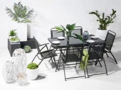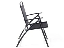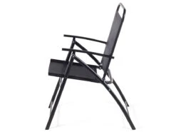 Práctico y moderno conjunto de 6 sillas de jardín . Este conjunto de sillas plegables con amplios apoyabrazos proporcionan asientos cómodos para el jardín, la terraza y el balcón. Las sillas son plegables, por lo que también puede ser una opción maravillosa en vacaciones, en la playa o en un picnic. Están elaborada en robusto acero negro, con revestimiento en polvo con una cubierta de textilene negro. Detalles: Tipo de Producto: Silla de jardín Estilo: Retro Color: Negro Tipo de material: Metal Material principal: Acero Material adicional: Poliéster Material de las patas: Acero Material del asiento: Tejido Composición del Material: 100% Poliéster Apoyabrazo: Sí Acabado: Revestimiento en polvo Plegable: Sí Apilable: No Dimensiones: Altura del apoyabrazos: 60 cm Profundidad: 66 cm Altura del asiento: 38 cm Ancho: 48 cm Altura: 90 cm Superficie del asiento: 45×45 cm Peso: 4 kg Capacidad de peso: 110 kg La oferta incluye: 6 x Silla Ventajas: Ancha superficie del asiento, Diseño moderno, Materiales de calidad, Fabricación sólida y precisa, Resistencia UV 4 (ISO 105-B05, Plegable para un fácil almacenamiento Información de montaje: No requiere montaje Texto de resistencia: Gracias a su resistencia al agua, puedes utilizar el producto al aire libre y dejarlo a la intemperie durante lluvias ligeras. Si no es posible guardarlo en un lugar cerrado y protegido, recomendamos utilizar una funda protectora. La exposición prolongada a la humedad puede provocar daños en el mueble. Resistencia: Agua ligera / humedad Consejos de mantenimiento: Poliéster: 1.El material es extremadamente resistente a la intemperie. Sin embargo, se recomienda utilizar una funda protectora para la temporada de invierno o, si es posible, guardar los muebles en un lugar fresco y seco 2.Manténgalo alejado de fuentes de calor, como parrilla o fuego, ya que las chispas pueden causar daños graves. No coloque utensilios calientes directamente sobre la superficie, 3.Limpiar con un limpiador a base de jabón suave y un paño suave Acero: 1.Los muebles de acero y sus elementos no deben exponerse al agua. De lo contrario, existe la posibilidad de que el agua oxidada salga de las tuberías del marco 2.Cuando no estén en uso, los muebles deben guardarse en el interior o bajo una cubierta protectora 3.Para aumentar la durabilidad del artículo, manténgalo seco y recuerde la limpieza regular 4.Cualquier daño a la capa de pintura exterior debe protegerse de la humedad 5.Para garantizar la protección contra la corrosión, evite los limpiadores alcalinos o ácidos. Después de limpiar, secar bien 6.Quite las tapas protectoras con regularidad para que salga todo el líquido, déjelas secar y utilice un spray anticorrosión si es necesario 7.Limpiar con detergentes suaves.