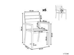 Moderno conjunto de sillas de jardín de madera sintética. Este conjunto de sillas de jardín elaborado de materiales resistentes a la intemperie y fáciles de limpiar es un complemento perfecto para cualquier terraza o jardín. El diseño de listones en madera sintética agrega un estilo atemporal y, junto con los apoyabrazos ajustados, garantiza una comodidad total para sentarse. El marco de aluminio inoxidable con recubrimiento en polvo hará que el asiento resistirá la prueba del tiempo. Detalles: Tipo de Producto: Silla de jardín Estilo: Moderno Color: Gris Tipo de material: Material sintético Material principal: Madera plástica Material adicional: Aluminio Material de las patas: Metal Material del asiento: Material sintético Apoyabrazo: Sí Acabado: Revestimiento en polvo Plegable: No Apilable: Sí Dimensiones: Altura del apoyabrazos: 21 cm Profundidad: 55 cm Altura del asiento: 42 cm Ancho: 55 cm Altura: 90 cm Superficie del asiento: 41×47 cm Peso: 7 kg Capacidad de peso: 130 kg La oferta incluye: 6 x Silla Ventajas: Combina con todo tipo de decoración, Perfecto para todo tipo de exterior, Ideal para uso en interiores y exteriores, Materiales reciclables y ecológicos, Apilable para un almacenaje mejor Información de montaje: No requiere montaje Información adicional: El producto viene con un libro de cuidados detallado para ayudarte a mantener tus muebles en las mejores condiciones durante muchos años. Consulta estos consejos para garantizar el mantenimiento adecuado de tus muebles nuevos – encontrarás las instrucciones de mantenimiento junto con el manual de montaje. Texto de resistencia: El producto es resistente al agua, lo que significa que no se dañará expuesto a la lluvia o en contacto con otros líquidos. Puede dejarlo al aire libre incluso durante fuertes lluvias o humedad. Durante la temporada de invierno es recomendable almacenar el producto en el interior o bajo una cubierta impermeable. Resistencia: Agua Consejos de mantenimiento: Madera plástica: 1.Limpiar con un limpiador a base de jabón suave y un paño suave, 2.El material es extremadamente resistente a la intemperie. Sin embargo, se recomienda utilizar una funda protectora para la temporada de invierno o, si es posible, guardar los muebles en un lugar fresco y seco 3.Manténgalo alejado de fuentes de calor, como parrilla o fuego, ya que las chispas pueden causar daños graves. No coloque utensilios calientes directamente sobre la superficie Aluminio: 1.Fuera de temporada, utilice una funda protectora o guarde los muebles en un lugar fresco y seco 2.Limpiar con agua jabonosa y detergentes suaves. Quitar el polvo con un paño suave.