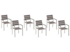Conjunto de sillas de jardín. Este conjunto de sillas está compuesto de materiales similares a madera más alta calidad. Tanto este material como el aluminio son reciclables y respetuosos con el medio ambiente. Los muebles son resistentes a la intemperie, los rayos UV y la suciedad. Detalles: Tipo de Producto: Silla de jardín Estilo: Industrial Color: Madera clara Tipo de material: Material sintético Material principal: Madera plástica Material adicional: Aluminio Material de las patas: Metal Material del asiento: Material sintético Apoyabrazo: Sí Acabado: Revestimiento en polvo Plegable: No Apilable: Sí Dimensiones: Altura del apoyabrazos: 65 cm Profundidad: 57 cm Altura del asiento: 41 cm Ancho: 54 cm Altura: 88 cm Superficie del asiento: 47×40 cm Peso: 6 kg Capacidad de peso: 150 kg La oferta incluye: 6 x Silla Ventajas: Perfecto para todo tipo de exterior, Diseño atemporal, Ideal para uso en interiores y exteriores, Muy fácil de conservar, Apilable, ahorra espacio Información de montaje: No requiere montaje Información adicional: Evita colocar objetos de vidrio sobre la superficie del producto. Este material aumenta la temperatura de la luz solar, lo que puede causar sobrecalentamiento y daños al artículo. El producto viene con un libro de cuidados detallado para ayudarte a mantener tus muebles en las mejores condiciones durante muchos años. Consulta estos consejos para garantizar el mantenimiento adecuado de tus muebles nuevos – encontrarás las instrucciones de mantenimiento junto con el manual de montaje. Texto de resistencia: El producto es resistente al agua, lo que significa que no se dañará expuesto a la lluvia o en contacto con otros líquidos. Puede dejarlo al aire libre incluso durante fuertes lluvias o humedad. Durante la temporada de invierno es recomendable almacenar el producto en el interior o bajo una cubierta impermeable. Resistencia: Agua Consejos de mantenimiento: Aluminio: 1.Fuera de temporada, utilice una funda protectora o guarde los muebles en un lugar fresco y seco 2.Limpiar con agua jabonosa y detergentes suaves. Quitar el polvo con un paño suave. Madera plástica: 1.Manténgalo alejado de fuentes de calor, como parrilla o fuego, ya que las chispas pueden causar daños graves. No coloque utensilios calientes directamente sobre la superficie, 2.Limpiar con un limpiador a base de jabón suave y un paño suave, 3.El material es extremadamente resistente a la intemperie. Sin embargo, se recomienda utilizar una funda protectora para la temporada de invierno o, si es posible, guardar los muebles en un lugar fresco y seco.