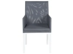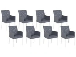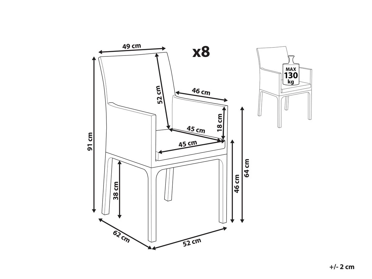 Juego de sillas de jardín. Este conjunto de 8 sillas de jardín de estilo clásico combina bien con cualquier decoración exterior. Está fabricado a partir de tela de poliéster resistente a los rayo UV. Los reposabrazos empotrados y el respaldo alto ofrecen comodidad. Los cojines gruesos vienen con una funda impermeable. Detalles: Tipo de Producto: Silla de jardín Estilo: Moderno Color: Gris Tonalidad: Gris oscuro Tipo de material: Tejido Material principal: Poliéster Material adicional: Aluminio Material de las patas: Metal Material del asiento: Tejido Composición del Material: 100% Poliéster Apoyabrazo: Sí Acabado: Revestimiento en polvo Plegable: No Apilable: No Dimensiones: Altura del apoyabrazos: 64 cm Profundidad: 62 cm Espesor del asiento: 5 cm Altura del asiento: 46 cm Ancho: 52 cm Altura: 91 cm Superficie del asiento: 45×45 cm Peso: 6 kg Capacidad de peso: 130 kg La oferta incluye: 8 x Silla Ventajas: Anchos repozabrazos y respaldo acogedor, Diseño tradicional con un toque moderno, Robusto marco resistente a la corrosión, Ideal para uso al aire libre, Resistencia UV 5 (ISO 105-B02 Información de montaje: Requiere montaje de las patas. Más de 60 min. Información adicional: Para una mayor estabilidad y seguridad de uso, se recomienda verificar 2 semanas después de la instalación que el montaje del producto ha sido realizado de forma correcta. Revisa, al menos una vez cada 3 meses, que los tornillos estén bien apretados. Texto de resistencia: El producto es resistente al agua, lo que significa que no se dañará expuesto a la lluvia o en contacto con otros líquidos. Puede dejarlo al aire libre incluso durante fuertes lluvias o humedad. Durante la temporada de invierno es recomendable almacenar el producto en el interior o bajo una cubierta impermeable. Resistencia: Agua Consejos de mantenimiento: Aluminio: 1.Fuera de temporada, utilice una funda protectora o guarde los muebles en un lugar fresco y seco 2.Limpiar con agua jabonosa y detergentes suaves. Quitar el polvo con un paño suave. Poliéster: 1.Manténgalo alejado de fuentes de calor, como parrilla o fuego, ya que las chispas pueden causar daños graves. No coloque utensilios calientes directamente sobre la superficie, 2.Limpiar con un limpiador a base de jabón suave y un paño suave, 3.El material es extremadamente resistente a la intemperie. Sin embargo, se recomienda utilizar una funda protectora para la temporada de invierno o, si es posible, guardar los muebles en un lugar fresco y seco.