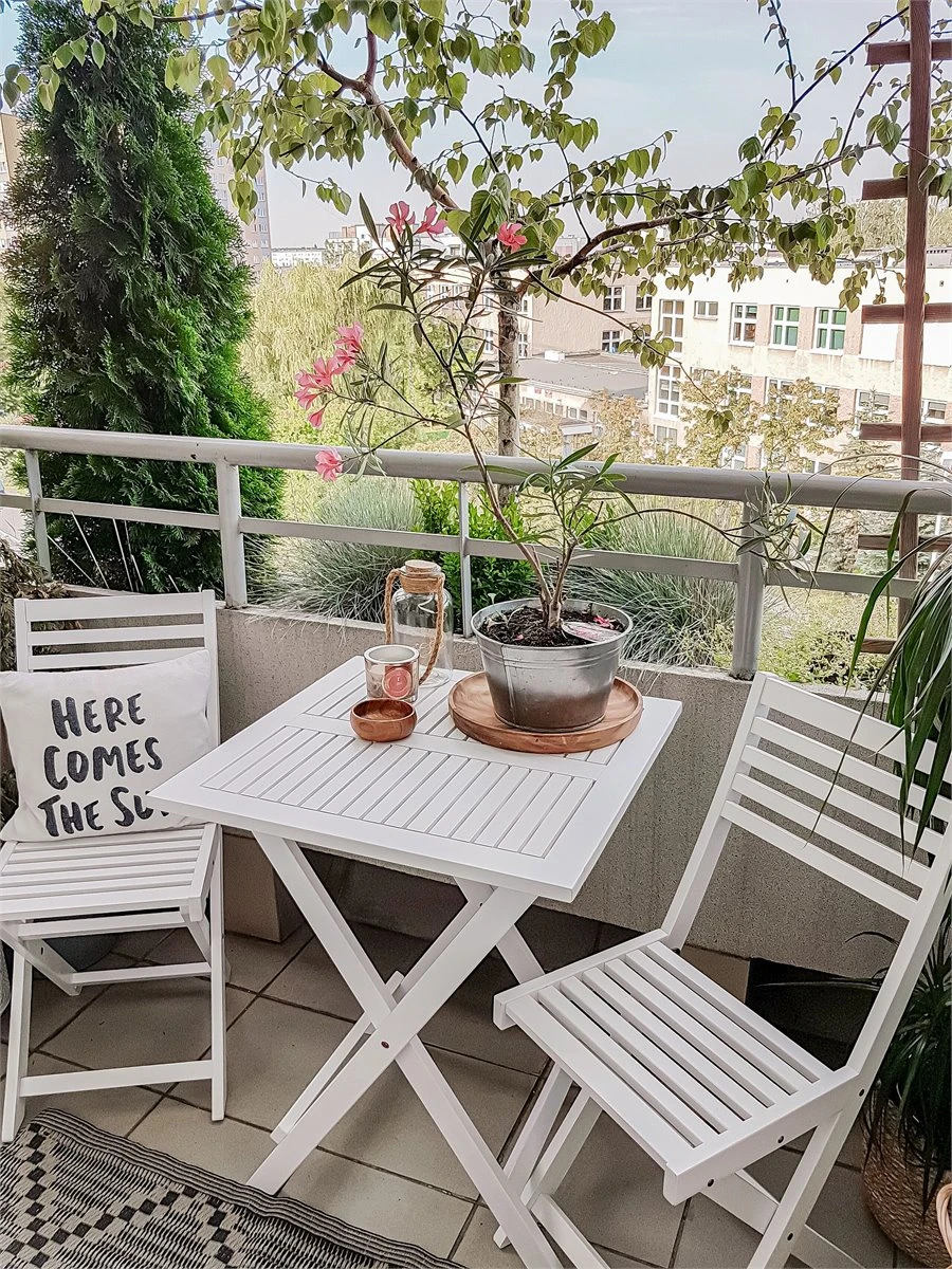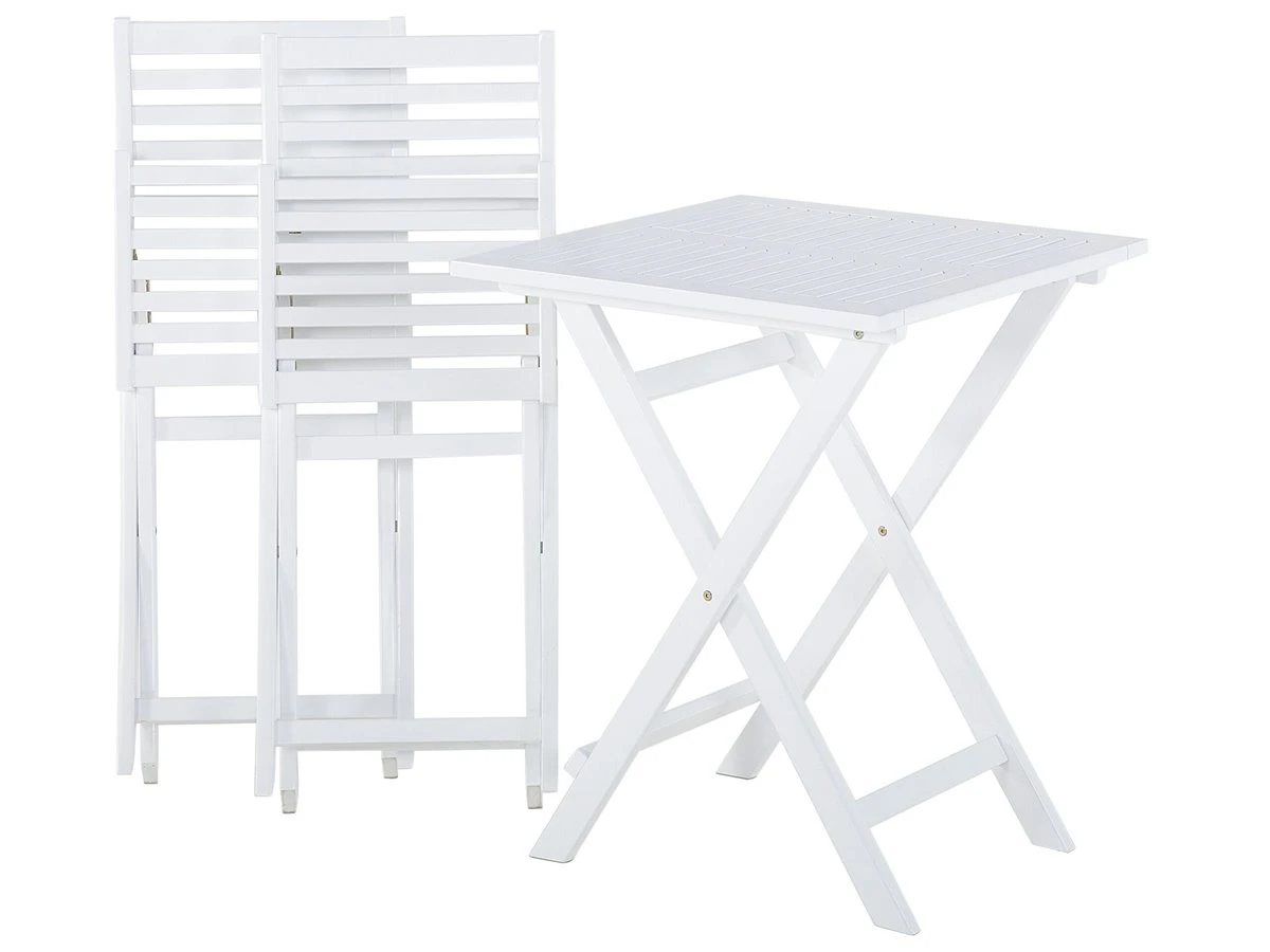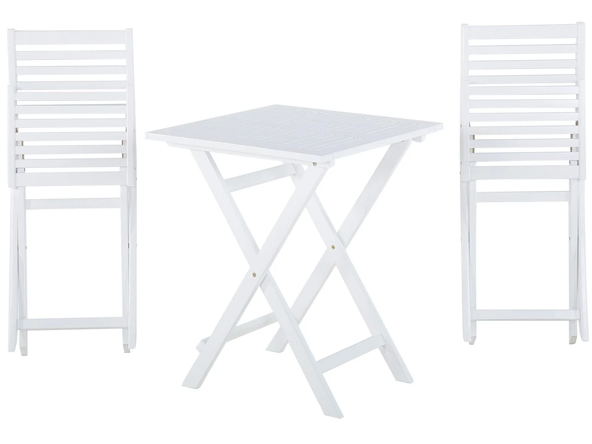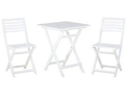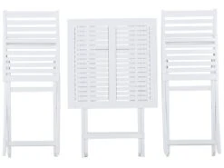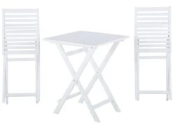Conjunto de mesa y 2 sillas de madera. Este conjunto de balcón es una adición perfecta a cualquier jardín de estilo náutico o campestre. El juego es plegable, fácil de instalar y se puede guardar sin esfuerzo durante la temporada baja. Detalles: Tipo de Producto: Conjunto bistro Estilo: Escandinavo Color: Blanco Tipo de material: Madera maciza Material principal: Madera de acacia Material de la superficie: Madera maciza Acabado: Pintado Dimensiones: Dimensiones de la silla: 37x44x84 cm Dimensiones de la mesa de centro: 60x60x75 Altura del asiento: 45 cm Peso: 18 kg Capacidad de peso de la silla: 120 kg Capacidad de peso de la mesa: 120 kg La oferta incluye: 1 x Mesa, 2 x Silla Ventajas: Perfecto para todo tipo de exterior, Los nudos y vetas de madera natural hacen que cada pieza sea única, Materiales de la más alta calidad, Plegable para un fácil almacenamiento, Mantenimiento sencillo Información de montaje: Requiere montaje parcial. 20-40 min. Información adicional: El producto viene con un libro de cuidados detallado para ayudarte a mantener tus muebles en las mejores condiciones durante muchos años. Consulta estos consejos para garantizar el mantenimiento adecuado de tus muebles nuevos – encontrarás las instrucciones de mantenimiento junto con el manual de montaje. Texto de resistencia: Gracias a su resistencia al agua, puedes utilizar el producto al aire libre y dejarlo a la intemperie durante lluvias ligeras. Si no es posible guardarlo en un lugar cerrado y protegido, recomendamos utilizar una funda protectora. La exposición prolongada a la humedad puede provocar daños en el mueble. Resistencia: Agua ligera / humedad Consejos de mantenimiento: Madera de acacia: 1.Los muebles con acabado de aceite deben volverse a engrasar antes de ponerlos en uso y al menos una vez al año, especialmente en el clima húmedo 2.Limpiar con un limpiador suave y un paño suave en la dirección de la veta. Secar con un paño inmediatamente después de limpiar 3.Durante el invierno o en condiciones climáticas adversas, utilice una funda protectora o guarde los muebles en el interior.