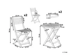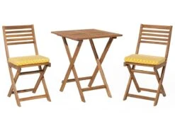 Conjunto de balcón con cojines. Este conjunto de balcón fabricado a partir de madera de acacia es una adición perfecta a cualquier jardín de estilo náutico o campestre. El juego es plegable, fácil de instalar y se puede guardar sin esfuerzo durante la temporada baja. Las sillas incluyen cojines a juego que proporcionan el mejor lugar para relajarse bajo el sol. Detalles: Tipo de Producto: Conjunto bistro Estilo: Tradicional Color: Madera clara Tipo de material: Madera maciza Material principal: Madera de acacia Material adicional: Poliéster Material de la superficie: Madera maciza Composición del Material: 100% Poliéster Acabado: Aceitado Densidad de espuma del asiento: 18 kg/m3 Dimensiones: Dimensiones de la silla: 37x44x84 cm Dimensiones de la mesa de centro: 60x60x75 Espesor del asiento: 5 cm Altura del asiento: 45 cm Peso: 17 kg Capacidad de peso de la silla: 120 kg Capacidad de peso de la mesa: 120 kg La oferta incluye: 1 x Mesa, 2 x Silla, 2 x Cojines del asiento Ventajas: Las tiras ofrecen una fijación segura, Asiento extremadamente cómodo, Perfecto para todo tipo de exterior, Materiales de la más alta calidad, Resistencia UV 5 (ISO 105-B02, Plegable para un fácil almacenamiento, Fundas de cojines con costuras ocultas y cremalleras Información de montaje: Requiere montaje parcial. 20-40 min. Información adicional: Por favor, ten en cuenta que la madera es un producto natural, y cada pieza puede presentar ligeras variaciones. Las diferencias en el color o la textura, como las arrugas u otras características naturales, no se consideran un defecto ni tampoco una base de reclamación, El producto viene con un libro de cuidados detallado para ayudarte a mantener tus muebles en las mejores condiciones durante muchos años. Consulta estos consejos para garantizar el mantenimiento adecuado de tus muebles nuevos – encontrarás las instrucciones de mantenimiento junto con el manual de montaje. Texto de resistencia: Gracias a su resistencia al agua, puedes utilizar el producto al aire libre y dejarlo a la intemperie durante lluvias ligeras. Si no es posible guardarlo en un lugar cerrado y protegido, recomendamos utilizar una funda protectora. La exposición prolongada a la humedad puede provocar daños en el mueble. Resistencia: Agua ligera / humedad Consejos de mantenimiento: Madera de acacia: 1.Los muebles con acabado de aceite deben volverse a engrasar antes de ponerlos en uso y al menos una vez al año, especialmente en el clima húmedo 2.Limpiar con un limpiador suave y un paño suave en la dirección de la veta. Secar con un paño inmediatamente después de limpiar 3.Durante el invierno o en condiciones climáticas adversas, utilice una funda protectora o guarde los muebles en el interior. Poliéster: 1.Cuando no esté en uso, manténgalo en un lugar limpio y seco para protegerlo de las condiciones atmosféricas 2.No secar en secadora ni planchar 3.Lavar a mano únicamente, usar agua fría y un detergente suave.