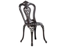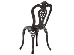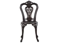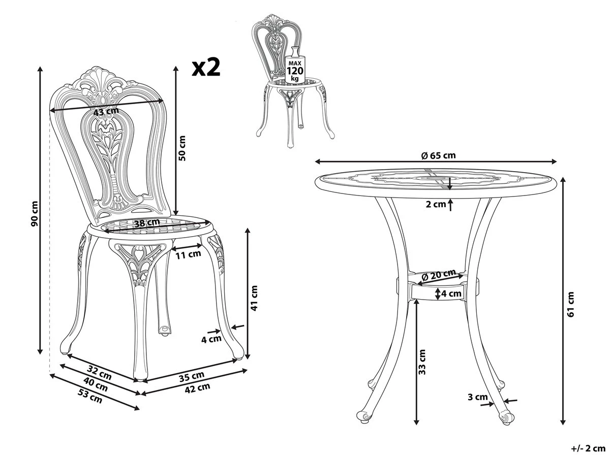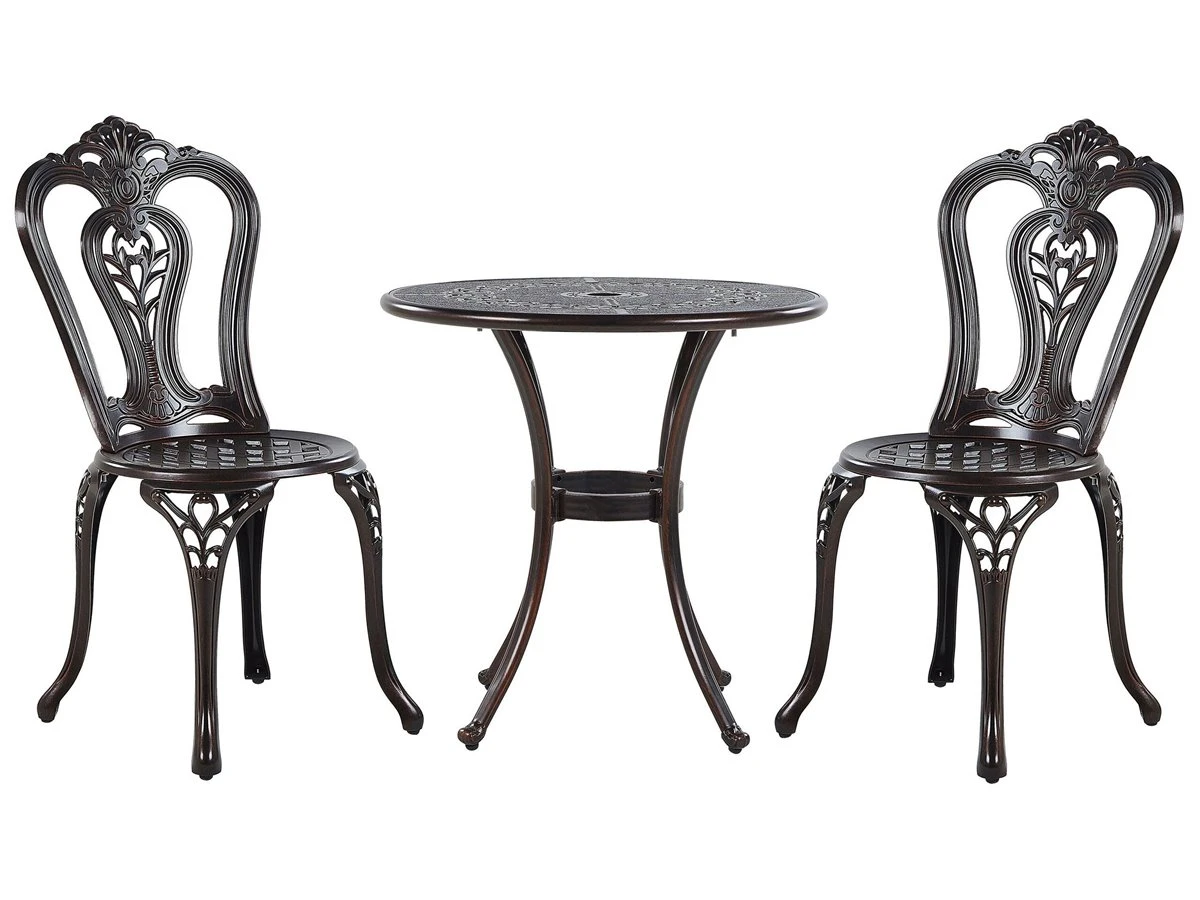 Juego de balcón de aluminio con diseño vintage. Elegante y práctico, este conjunto de balcón es perfecto para cualquier jardín, terraza o balcón. Fabricado en aluminio ligero y duradero, presenta un acabado en pintura en polvo marrón que aporta una mayor resistencia. La mesa contiene un tablero redondo, decorado con un patrón floral que dota al conjunto de un toque retro. El conjunto es lo suficientemente cómodo para 2 personas, gracias a sus asientos anchos y construcción robusta. Detalles: Tipo de Producto: Conjunto bistro Estilo: Retro Color: Marrón Tonalidad: Marrón oscuro Tipo de material: Metal Material principal: Aluminio Material de la superficie: Metal Acabado: Revestimiento en polvo Dimensiones: Dimensiones de la silla: 43x53x90 cm Dimensiones de la mesa de centro: 65x65x61 Altura del asiento: 41 cm Peso: 16 kg Capacidad de peso de la silla: 120 kg Capacidad de peso de la mesa: 60 kg La oferta incluye: 1 x Mesa, 2 x Silla Ventajas: Tablero con agujero para sombrilla, Diseño atemporal, Apariencia moderna y calidad durante muchos años, Detalles perfectos, Gran durabilidad, Ideal para uso al aire libre Información de montaje: Requiere montaje completo. 20-40 min. Información adicional: El efecto desgastado o las manchas visibles son intencionales y no se consideran un defecto. Texto de resistencia: Gracias al acabado especial, la superficie del producto es resistente a la oxidación. Esto significa que se puede utilizar en exteriores. Cuando el producto no esté en uso, se recomienda cubrirlo con una cubierta o colocarlo en un lugar seco. Resistencia: Intemperie Consejos de mantenimiento: Aluminio: 1.Fuera de temporada, utilice una funda protectora o guarde los muebles en un lugar fresco y seco 2.Limpiar con agua jabonosa y detergentes suaves. Quitar el polvo con un paño suave.