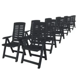Nuestro juego de comedor de exterior resistente a la intemperie será una gran opción para comer al aire libre en el jardín, en el patio o en el camping. El set de comedor para jardín está hecho de plástico duradero, por lo que la mesa y las sillas son resistentes a la intemperie y fáciles de limpiar. Este conjunto de comedor de plástico también es ligero y fácil de mover. La mesa de jardín tiene un agujero para colocar la sombrilla y poder mantenerse a la sombra. Los respaldos de las sillas tienen 4 opciones de reclinado, para que siempre encuentre la postura más cómoda. Las sillas se pueden plegar para ahorrar espacio cuando no se usen. La entrega incluye 1 mesa y 10 sillas plegables. Color: Gris antracitaMaterial: PlásticoMesa:Dimensiones: 216 x 90 x 72 cm (largo x ancho x altoCon un agujero parla sombrilla de 3,6 cm de diámetroSilla:Dimensiones: 60 x 61 x 108 cm (anchura x profundidad x alturaAnchura de asiento: 45 cmProfundidad del asiento: 49,5 cmAltura del asiento desde el suelo: 44 cmAltura del reposabrazos: 63 cm4 posiciones reclinablesResistente a la intemperiePlegable para un transporte fácilResistente a la intemperieLa entrega incluye 1 mesa y 10 sillas plegables