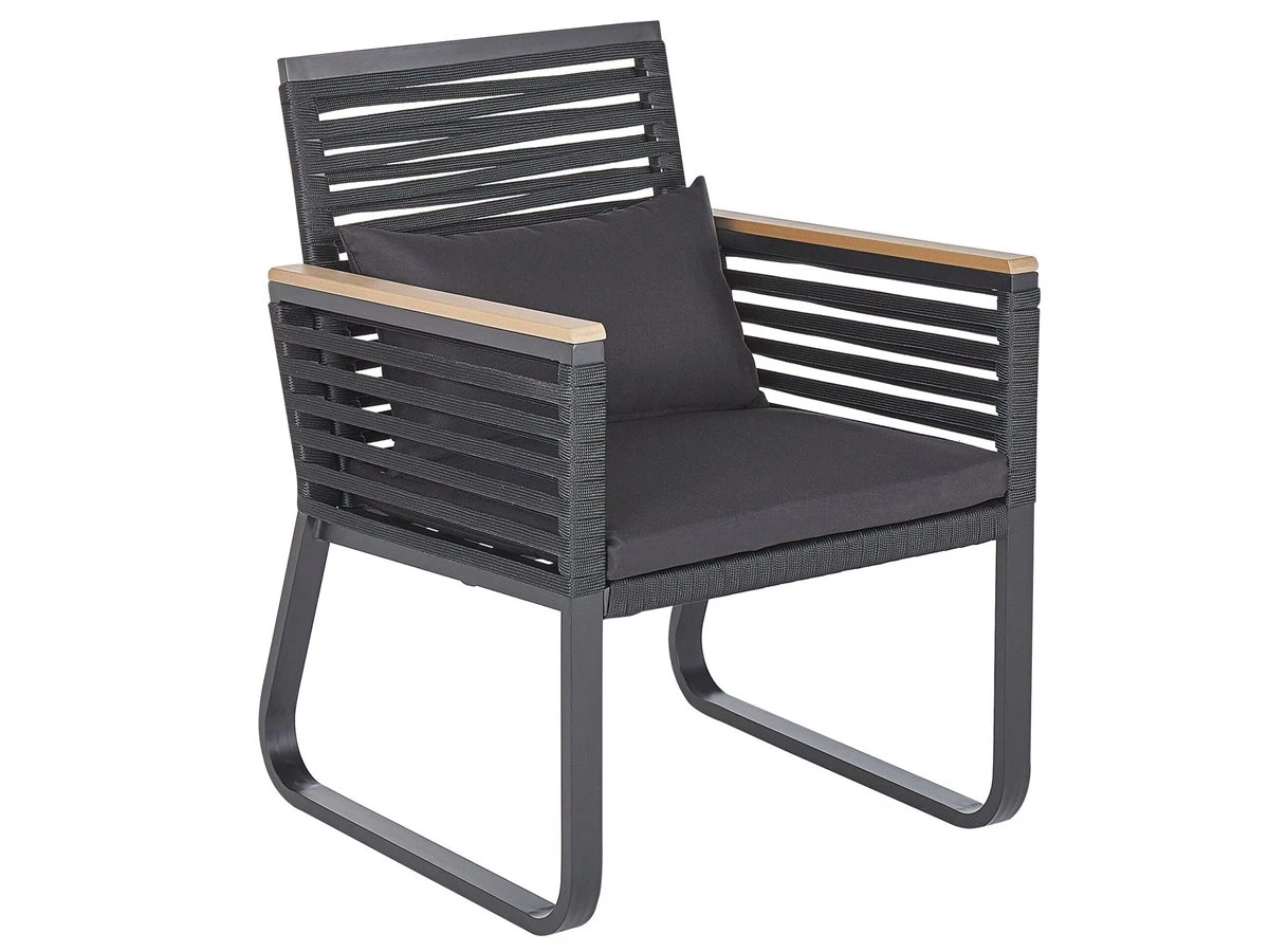 Set de jardín. Añade a tu área exterior este conjunto de jardín de estilo clásico. La construcción de aluminio proporciona estabilidad y los elementos de madera plástica en las sillas, comodidad. Los respaldos y asientos de estilo cuerda acolchados garantizan el mejor descanso. Coloca este juego en tu jardín y crea un comedor acogedor al aire libre. Detalles: Tipo de Producto: Conjunto de comedor Estilo: Moderno Color: Negro Tipo de material: Metal Material principal: Aluminio Material adicional: Poliéster Material de la superficie: Vidrio Composición del Material: 100% Poliéster Acabado: Revestimiento en polvo Densidad de espuma del asiento: 6 kg/m3 Dimensiones: Dimensiones de la silla: 60x65x83 cm Espesor del asiento: 3 cm Altura del asiento: 45 cm Dimensiones de la mesa: 150x90x76 cm Peso: 60 kg Capacidad de peso de la silla: 130 kg Capacidad de peso de la mesa: 200 kg La oferta incluye: 4 x Silla, 1 x Mesa, 4 x Cojín del asiento, 4 x Cojín del respaldo Ventajas: Tablero grueso de vidrio templado resistente, No requiere mantenimiento regular, Resistencia UV 6 (ISO 105-B02, Ideal para uso al aire libre, Fundas extraíbles, Patas con tapas antideslizantes de seguridad, Tablero en vidrio templado de seguridad Información de montaje: Requiere montaje parcial. Más de 60 min. Información adicional: Abre el embalaje con cuidado, especialmente cuando utilizas herramientas afiladas o puntiagudas, ya que pueden dañar el producto Texto de resistencia: El producto es resistente al viento, por lo que no debe volcarse ni perder estabilidad con ráfagas de viento. Resistencia: Viento Consejos de mantenimiento: Aluminio: 1.Fuera de temporada, utilice una funda protectora o guarde los muebles en un lugar fresco y seco 2.Limpiar con agua jabonosa y detergentes suaves. Quitar el polvo con un paño suave. Vidrio templado: 1.Limpiar con un detergente suave o acondicionador de vidrio con un paño suave. Secar después de limpiar 2.Secar después de la lluvia o la nieve. Durante el invierno, utilice una funda protectora o guarde los muebles en el interior 3.Para evitar rayones, no use un limpiador cremoso. Poliéster: 1.No secar en secadora ni planchar 2.Lavar a mano únicamente, usar agua fría y un detergente suave 3.Cuando no esté en uso, manténgalo en un lugar limpio y seco para protegerlo de las condiciones atmosféricas.