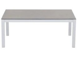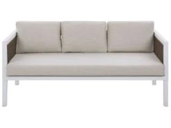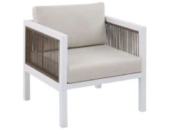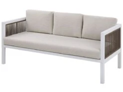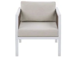 Set de jardín. Dale un cambio de imagen a tu área exterior con este conjunto de jardín de 5 plazas de estilo moderno. La construcción en metal resistente ofrece durabilidad. El tejido de cuerda en el respaldo aporta un cierto toque mediterráneo al conjunto. Detalles: Tipo de Producto: Conjunto de jardín Estilo: Moderno Color: Blanco Tipo de material: Metal Material principal: Aluminio Material adicional: Poliéster Material de la superficie: Vidrio Composición del Material: 100% Poliéster Acabado: Revestimiento en polvo Densidad de espuma del asiento: 22 kg/m3 Dimensiones: Dimensiones del sofá de 3 plazas: 159x70x66 Dimensiones del sillón: 68x70x66 Dimensiones de la mesa de centro: 100x56x42 Espesor del asiento: 11 cm Altura del asiento: 41 cm Peso: 56 kg Capacidad de peso de la mesa: 80 kg Capacidad de peso por persona: 160 kg La oferta incluye: 1 x Mesa de centro, 1 x Sofá, 2 x Sillón, Cojines incluidos Ventajas: Muy cómodo, Diseño atemporal, Estructura duradera y sólida, Alta calidad, Muy fácil de conservar, Resistencia UV 5 (ISO 105-B02, Fundas de cojines con costuras ocultas y cremalleras, Tablero en vidrio templado de seguridad Información de montaje: Requiere montaje parcial. 45-60 min. Texto de resistencia: Gracias a su resistencia al agua, puedes utilizar el producto al aire libre y dejarlo a la intemperie durante lluvias ligeras. Si no es posible guardarlo en un lugar cerrado y protegido, recomendamos utilizar una funda protectora. La exposición prolongada a la humedad puede provocar daños en el mueble. Resistencia: Agua ligera / humedad Consejos de mantenimiento: Aluminio: 1.Fuera de temporada, utilice una funda protectora o guarde los muebles en un lugar fresco y seco 2.Limpiar con agua jabonosa y detergentes suaves. Quitar el polvo con un paño suave. Poliéster: 1.No secar en secadora ni planchar 2.Lavar a mano únicamente, usar agua fría y un detergente suave 3.Cuando no esté en uso, manténgalo en un lugar limpio y seco para protegerlo de las condiciones atmosféricas. Vidrio templado: 1.Limpiar con un detergente suave o acondicionador de vidrio con un paño suave. Secar después de limpiar 2.Secar después de la lluvia o la nieve. Durante el invierno, utilice una funda protectora o guarde los muebles en el interior 3.Para evitar rayones, no use un limpiador cremoso.