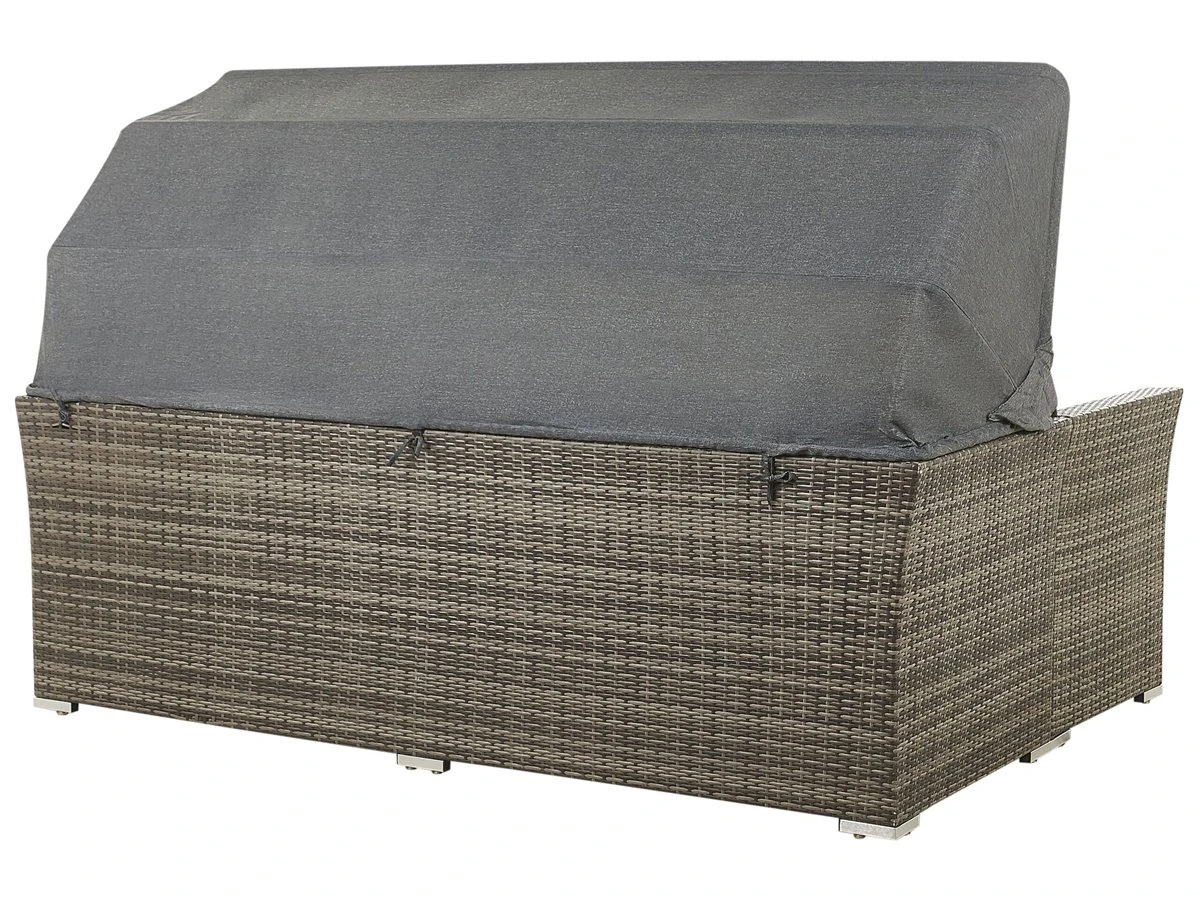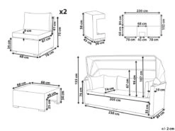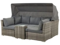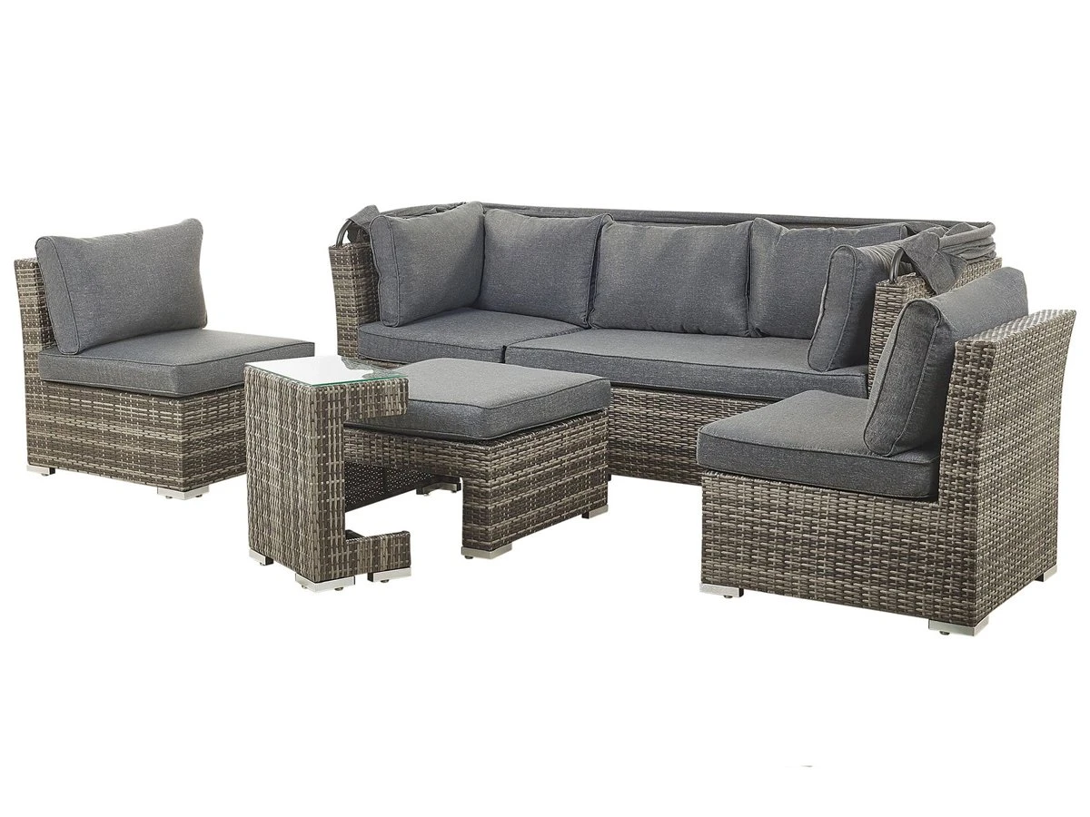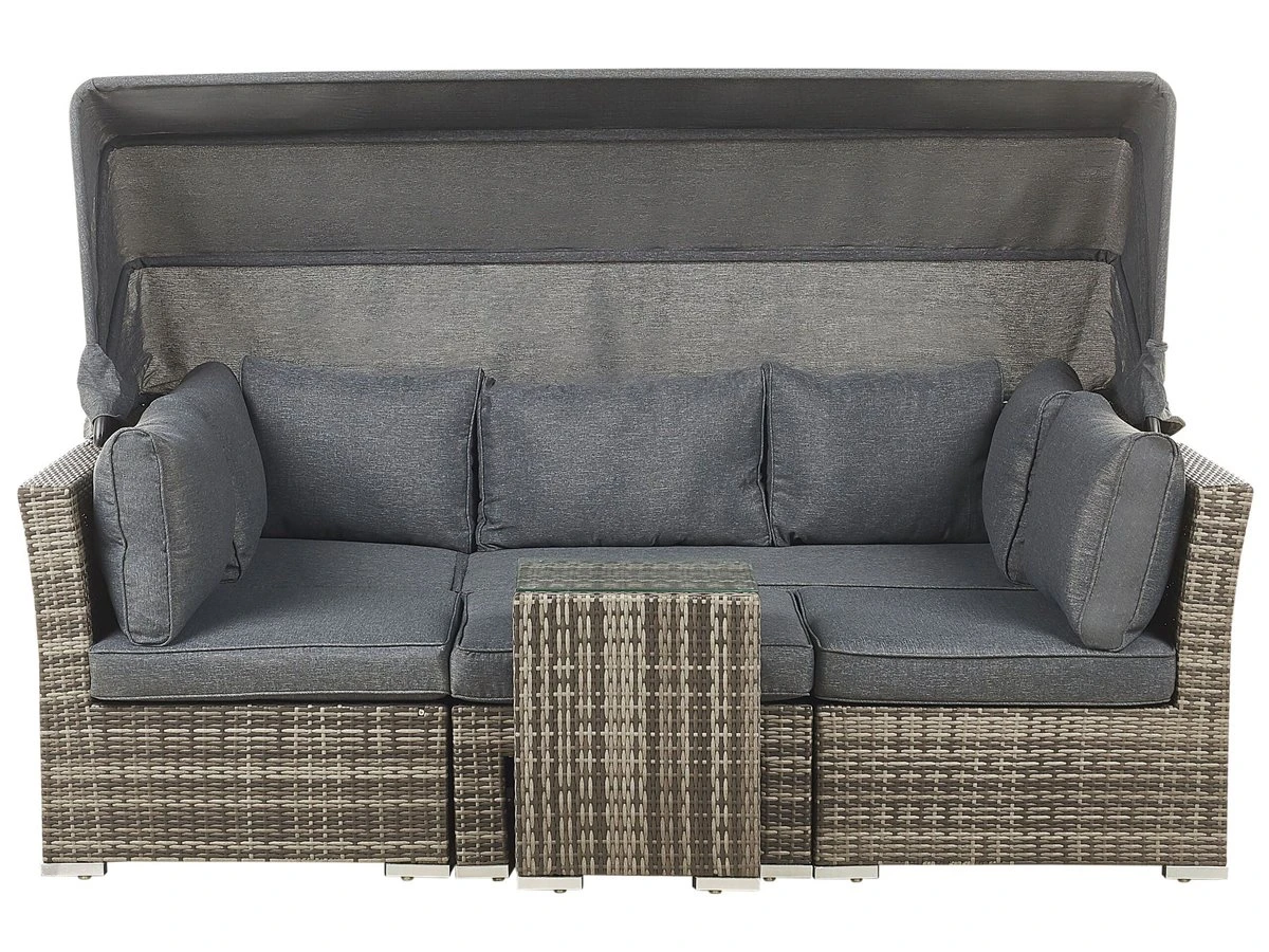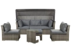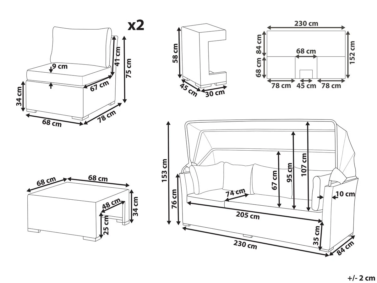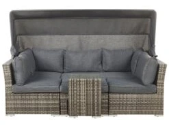 Conjunto modular de exterior con mesa auxiliar y otomana. Eleva el aspecto de tu área al aire libre con este juego de muebles para 6 personas. Compuesto por un sofá de 3 plazas, sillas y una otomana multifuncional, es un complemento perfecto para cualquier jardín, ya sea para invitar a amigos a una fiesta o para relajarse solo. El sofá está equipado con un dosel, que te permite esconderte del sol cuando hace demasiado calor, mientras que los asientos laterales se pueden levantar para agregar un respaldo adicional y convertirlos en tumbonas. El juego viene con una pequeña mesa auxiliar, que te permitirá guardar tus bebidas u otros artículos. Cada pieza está hecha de mimbre sintético duradero y de fácil cuidado, que se caracteriza por una alta protección UV. El marco interior está hecho de aluminio, lo que garantiza la estabilidad de toda la construcción, y cada superficie para sentarse viene con un cojín gris, para aumentar adicionalmente la comodidad. Detalles: Tipo de Producto: Conjunto longue Estilo: Tradicional Color: Marrón Tonalidad: Marrón oscuro Tipo de material: Ratán sintético Material principal: Ratán sintético Material adicional: Poliéster Material de la superficie: Material sintético Composición del Material: 100% Poliéster Forma: Rectangular Acabado: Revestimiento en polvo Densidad de espuma del asiento: 22 kg/m3 Dimensiones: Dimensiones del sillón: 68x78x75 Dimensiones de la mesa de centro: 68x68x34 Espesor del asiento: 9 cm Altura del asiento: 44 cm Dimensiones de la mesa auxiliar: 45x30x58 Dimensiones del sofá: 230x84x76 Dimensiones totales: 230x152x153 Peso: 68 kg Capacidad de peso de la mesa: 70/50 kg Capacidad de peso por persona: 100 kg La oferta incluye: 1 x Sofá, 1 x Mesa auxiliar, 1 x Puf, 2 x Sillón, 5 x Cojín del asiento, 7 x Cojín del respaldo Ventajas: La práctica cubertura brindará protección contra el viento y el sol, Asientos laterales elevables, Construcción muy estable, Resistencia UV 5 (ISO 105-B02, Ideal para uso al aire libre, Varias posibilidades de ubicación, Fundas extraíbles, Tablero en vidrio templado de seguridad Información de montaje: No requiere montaje Información adicional: El producto viene con un libro de cuidados detallado para ayudarte a mantener tus muebles en las mejores condiciones durante muchos años. Consulta estos consejos para garantizar el mantenimiento adecuado de tus muebles nuevos – encontrarás las instrucciones de mantenimiento junto con el manual de montaje. Texto de resistencia: El producto está hecho con tela resistente a los rayos UV, lo que significa que se puede usar bajo la luz del sol sin preocuparse por la pérdida de color. En cualquier caso, es recomendable colocar los muebles debajo de una cubierta impermeable cuando no se utilicen, para asegurar su máxima durabilidad. Resistencia: Rayos UV Consejos de mantenimiento: Ratán sintético: 1.Se recomienda utilizar una funda protectora para la temporada de invierno o, si es posible, para mantener los muebles secos y frescos en el interior 2.Limpiar con detergentes a base de jabón. No utilizar limpiadores químicos corrosivos 3.Los utensilios o accesorios de vidrio pueden sobrecalentar la superficie 4.Para alargar la vida útil del mueble, protéjalo de la exposición directa al sol. Poliéster: 1.Lavar a mano o seleccionar un ciclo de lavado de lana (30 ° C, a menos que el fabricante especifique lo contrario. Lavar del revés con la cremallera cerrada 2.Cuando no esté en uso, manténgalo en un lugar limpio y seco para protegerlo de las condiciones atmosféricas 3.No secar en secadora y no planchar. Vidrio: 1.Secar después de la lluvia o la nieve. Durante el invierno, utilice una funda protectora o guarde los muebles en el interior 2.Para evitar rayones, no use un limpiador cremoso 3.Limpiar con un detergente suave o acondicionador de vidrio con un paño suave. Secar después de limpiar.