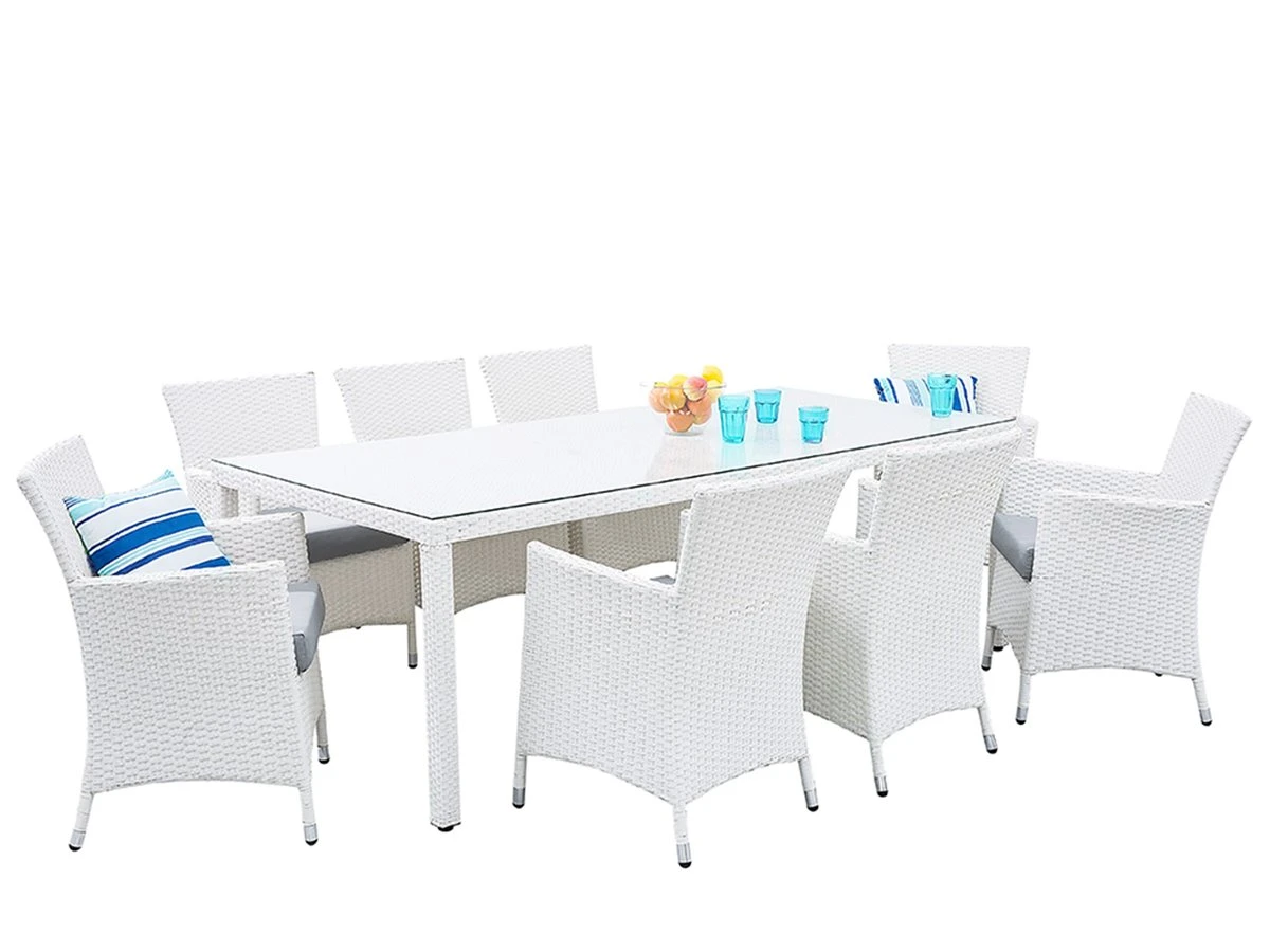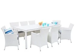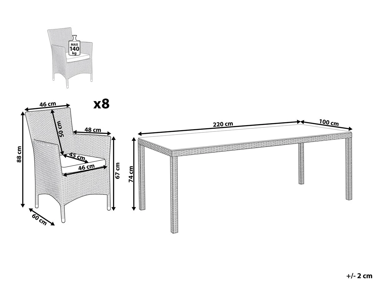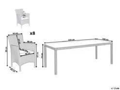 Set de jardín. Aprovecha las tardes de verano relajándote en el sol, conversando mientras disfrutas de una barbacoa o leyendo el periódico. La gran mesa de comedor rectangular permitirá ubicar a todos tus invitados. El estable marco de aluminio con revestimiento en polvo está cuidadosamente trenzado con el mimbre blanco que crea una atmósfera excepcionalmente acogedora y cálida. La superficie de la mesa es de vidrio templado transparente con bordes redondeados es de fácil conservación. Las sillas son un asiento único con cómodos apoyabrazos. Las fundas de los cojines son resistentes a las manchas, a la humedad y pueden lavarse a 40°C. El poli ratán, mimbre sintético ecológico, debido a su alta calidad, excepcional resistencia a las inclemencias del tiempo y la durabilidad, es muy popular y adecuado para el uso al aire libre. Detalles: Tipo de Producto: Conjunto de comedor Estilo: Moderno Color: Marrón Tonalidad: Marrón oscuro Tipo de material: Ratán sintético Material principal: Ratán sintético Material adicional: Vidrio templado Material de la superficie: Vidrio Composición del Material: 100% Poliéster Acabado: Revestimiento en polvo Densidad de espuma del asiento: 25 kg/m3 Dimensiones: Dimensiones de la silla: 52x60x88 cm Espesor del asiento: 5 cm Altura del asiento: 41 cm Dimensiones de la mesa: 220x100x74 cm Peso: 59 kg Capacidad de peso de la silla: 140 kg Capacidad de peso de la mesa: 40 kg La oferta incluye: 8 x Silla, 1 x Mesa, 8 x Cojín del respaldo Ventajas: Patas estables y resistentes, Crea un ambiente acogedor, Ideal para uso al aire libre, Resistencia UV 5 (ISO 105-B02, Muy ligero y fácil de desplazar, Muchas posibilidades de posición, Fundas extraíbles, Tablero en vidrio templado de seguridad Información de montaje: Requiere montaje parcial. 20-40 min. Información adicional: El producto viene con un libro de cuidados detallado para ayudarte a mantener tus muebles en las mejores condiciones durante muchos años. Consulta estos consejos para garantizar el mantenimiento adecuado de tus muebles nuevos – encontrarás las instrucciones de mantenimiento junto con el manual de montaje. Texto de resistencia: Gracias a su resistencia al agua, puedes utilizar el producto al aire libre y dejarlo a la intemperie durante lluvias ligeras. Si no es posible guardarlo en un lugar cerrado y protegido, recomendamos utilizar una funda protectora. La exposición prolongada a la humedad puede provocar daños en el mueble. Resistencia: Agua ligera / humedad Consejos de mantenimiento: Ratán sintético: 1.Los utensilios o accesorios de vidrio pueden sobrecalentar la superficie 2.Para alargar la vida útil del mueble, protéjalo de la exposición directa al sol 3.Se recomienda utilizar una funda protectora para la temporada de invierno o, si es posible, para mantener los muebles secos y frescos en el interior 4.Limpiar con detergentes a base de jabón. No utilizar limpiadores químicos corrosivos. Poliéster: 1.Cuando no esté en uso, manténgalo en un lugar limpio y seco para protegerlo de las condiciones atmosféricas 2.No secar en secadora ni planchar 3.Lavar a mano únicamente, usar agua fría y un detergente suave. Vidrio templado: 1.Para evitar rayones, no use un limpiador cremoso 2.Limpiar con un detergente suave o acondicionador de vidrio con un paño suave. Secar después de limpiar 3.Secar después de la lluvia o la nieve. Durante el invierno, utilice una funda protectora o guarde los muebles en el interior.