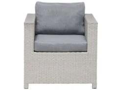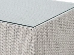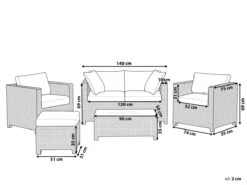 Conjunto de jardín en ratán. Este conjunto de jardín elegante y confortable es una opción perfecta para un jardín o terraza. Su marco está hecho de acero con recubrimiento de polvo. La construcción resistente se complementa con ratán sintético resistente a la intemperie y de fácil mantenimiento que garantiza la longevidad del conjunto. Los cojines de espuma de alta densidad están cubiertos con una tela blanca repelente al agua y resistente a las manchas. Los prácticos reposabrazos y los relajantes respaldos lo convierten en un área de descanso cómoda para un grupo grande. Detalles: Tipo de Producto: Conjunto de jardín Estilo: Escandinavo Color: Gris Tonalidad: Gris claro Tipo de material: Ratán sintético Material principal: Ratán sintético Material adicional: Vidrio templado Material de la superficie: Vidrio Composición del Material: 100% Poliéster Acabado: Revestimiento en polvo Dimensiones: Dimensiones del sofá de 2 plazas: 140x75x69 Dimensiones del sillón: 74x75x69 Dimensiones de la mesa de centro: 90x50x35 Dimensiones del reposapies: 51x51x35 cm Espesor del asiento: 10 cm Altura del asiento: 38 cm Peso: 59 kg Capacidad de peso de la mesa: 70 kg Capacidad de peso por persona: 130 kg La oferta incluye: 1 x Mesa, 1 x Sofá de 2 plazas, 2 x Sillón, 1 x Taburete, Cojines incluidos Ventajas: Perfecto para todo tipo de exterior, Materiales de calidad, Resistencia UV 5 (ISO 105-B02, Tejido sólido, Fundas de cojines con costuras ocultas y cremalleras, Tablero en vidrio templado de seguridad Información de montaje: No requiere montaje Información adicional: El producto viene con un libro de cuidados detallado para ayudarte a mantener tus muebles en las mejores condiciones durante muchos años. Consulta estos consejos para garantizar el mantenimiento adecuado de tus muebles nuevos – encontrarás las instrucciones de mantenimiento junto con el manual de montaje. Texto de resistencia: Gracias al acabado especial, la superficie del producto es resistente a la oxidación. Esto significa que se puede utilizar en exteriores. Cuando el producto no esté en uso, se recomienda cubrirlo con una cubierta o colocarlo en un lugar seco. Resistencia: Intemperie Consejos de mantenimiento: Ratán sintético: 1.Para alargar la vida útil del mueble, protéjalo de la exposición directa al sol 2.Se recomienda utilizar una funda protectora para la temporada de invierno o, si es posible, para mantener los muebles secos y frescos en el interior 3.Limpiar con detergentes a base de jabón. No utilizar limpiadores químicos corrosivos 4.Los utensilios o accesorios de vidrio pueden sobrecalentar la superficie. Poliéster: 1.No secar en secadora ni planchar 2.Lavar a mano únicamente, usar agua fría y un detergente suave 3.Cuando no esté en uso, manténgalo en un lugar limpio y seco para protegerlo de las condiciones atmosféricas. Vidrio templado: 1.Secar después de la lluvia o la nieve. Durante el invierno, utilice una funda protectora o guarde los muebles en el interior 2.Para evitar rayones, no use un limpiador cremoso 3.Limpiar con un detergente suave o acondicionador de vidrio con un paño suave. Secar después de limpiar.