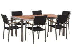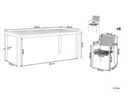 Moderno conjunto de jardín con mesa en madera de eucalipto. Añade elegancia a tu zona exterior con este conjunto de comedor. Está constituido por una mesa y 6 sillas. Fabricado a partir de acero inoxidable duradero y madera de eucalipto resistente a la intemperie. Las sillas son resistentes a los rayos UV y apilables, lo que permite ahorrar espacio. Detalles: Tipo de Producto: Conjunto de comedor Estilo: Moderno Color: Madera clara Tipo de material: Madera maciza Material principal: Madera de eucalipto Material adicional: Madera plástica Material de la superficie: Madera maciza Composición del Material: 90% PVC Acabado: Aceitado Dimensiones: Dimensiones de la silla: 55x58x87 cm Altura del asiento: 44 cm Dimensiones de la mesa: 180x90x74 cm Peso: 74 kg Capacidad de peso de la silla: 160 kg Capacidad de peso de la mesa: 75 kg La oferta incluye: 1 x Mesa, 6 x Silla Ventajas: Perfecto para todo tipo de exterior, Los nudos y vetas de madera natural hacen que cada pieza sea única, Materiales de calidad, Resistencia UV 4 (ISO 105-B02, Estructura sólida y estable, Apilable para un almacenaje mejor, Montaje muy sencillo Información de montaje: Requiere montaje completo. 20-40 min. Información adicional: El producto viene con un libro de cuidados detallado para ayudarte a mantener tus muebles en las mejores condiciones durante muchos años. Consulta estos consejos para garantizar el mantenimiento adecuado de tus muebles nuevos – encontrarás las instrucciones de mantenimiento junto con el manual de montaje. Por favor, ten en cuenta que la madera es un producto natural, y cada pieza puede presentar ligeras variaciones. Las diferencias en el color o la textura, como las arrugas u otras características naturales, no se consideran un defecto ni tampoco una base de reclamación Texto de resistencia: Gracias a su resistencia al agua, puedes utilizar el producto al aire libre y dejarlo a la intemperie durante lluvias ligeras. Si no es posible guardarlo en un lugar cerrado y protegido, recomendamos utilizar una funda protectora. La exposición prolongada a la humedad puede provocar daños en el mueble. Resistencia: Agua ligera / humedad Consejos de mantenimiento: Madera de eucalipto: 1.Limpiar con un limpiador suave y un paño suave en la dirección de la veta. Secar con un paño inmediatamente después de limpiar 2.Durante el invierno o en condiciones climáticas adversas, utilice una funda protectora o guarde los muebles en el interior 3.Los muebles con acabado de aceite deben volverse a engrasar antes de ponerlos en uso y al menos una vez al año, especialmente en el clima húmedo. Acero inoxidable: 1.Limpiar solo con agentes de limpieza suaves. No utilice limpiadores alcalinos o ácidos 2.Las lluvias ácidas, el agua salada y las tormentas de arena pueden dañar la capa protectora 3.Durante el invierno, utilice una funda protectora o guarde los muebles en el interior 4.Durante la lluvia, se recomienda utilizar una funda protectora.
