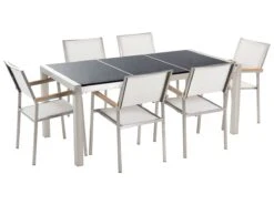 Lujoso conjunto de comedor para jardín, mesa con superficie de piedra natural. Añade elegancia a tu zona exterior con este conjunto de comedor. Está constituido por una mesa y 6 sillas. Fabricado a partir de acero inoxidable duradero y granito resistente a la intemperie. Las sillas son resistentes a los rayos UV y apilables, lo que permite ahorrar espacio. Detalles: Tipo de Producto: Conjunto de comedor Estilo: Moderno Color: Negro Tonalidad: Grafito Tipo de material: Piedra Material principal: Acero inoxidable Material adicional: Madera plástica Material de la superficie: Piedra Composición del Material: 90% PVC Acabado: Pulido Dimensiones: Dimensiones de la silla: 55x58x87 cm Altura del asiento: 44 cm Dimensiones de la mesa: 180x90x74 cm Peso: 135 kg Capacidad de peso de la silla: 160 kg Capacidad de peso de la mesa: 70 kg La oferta incluye: 1 x Mesa, 6 x Silla Ventajas: Perfecto para todo tipo de exterior, Robusto marco resistente a la corrosión, Resistencia UV 4 (ISO 105-B02, Resistente a las manchas, Material impermeable y muy fácil de conservar, Apilable para un almacenaje mejor, Montaje muy sencillo Información de montaje: Requiere montaje parcial. 20-40 min. Información adicional: El producto viene con un libro de cuidados detallado para ayudarte a mantener tus muebles en las mejores condiciones durante muchos años. Consulta estos consejos para garantizar el mantenimiento adecuado de tus muebles nuevos – encontrarás las instrucciones de mantenimiento junto con el manual de montaje. Texto de resistencia: Gracias a su resistencia al agua, puedes utilizar el producto al aire libre y dejarlo a la intemperie durante lluvias ligeras. Si no es posible guardarlo en un lugar cerrado y protegido, recomendamos utilizar una funda protectora. La exposición prolongada a la humedad puede provocar daños en el mueble. Resistencia: Agua ligera / humedad Consejos de mantenimiento: Granito: 1.Seque con un paño después de limpiar 2.Durante el invierno, use una cubierta protectora o guarde los muebles en el interior 3.Utilice solo detergentes suaves o limpiadores específicos para granito. No utilice limpiadores abrasivos. Secar después de limpiar 4.Las manchas difíciles como la salsa de tomate o el vino tinto penetran rápidamente en la superficie y, por lo tanto, deben eliminarse inmediatamente. Acero inoxidable: 1.Las lluvias ácidas, el agua salada y las tormentas de arena pueden dañar la capa protectora 2.Durante el invierno, utilice una funda protectora o guarde los muebles en el interior 3.Durante la lluvia, se recomienda utilizar una funda protectora 4.Limpiar solo con agentes de limpieza suaves. No utilice limpiadores alcalinos o ácidos. Textil trenzado: 1.El material es extremadamente resistente a la intemperie. Sin embargo, se recomienda utilizar una funda protectora para la temporada de invierno o, si es posible, guardar los muebles en un lugar fresco y seco 2.Manténgalo alejado de fuentes de calor, como parrilla o fuego, ya que las chispas pueden causar daños graves. No coloque utensilios calientes directamente sobre la superficie, 3.Limpiar con un limpiador a base de jabón suave y un paño suave