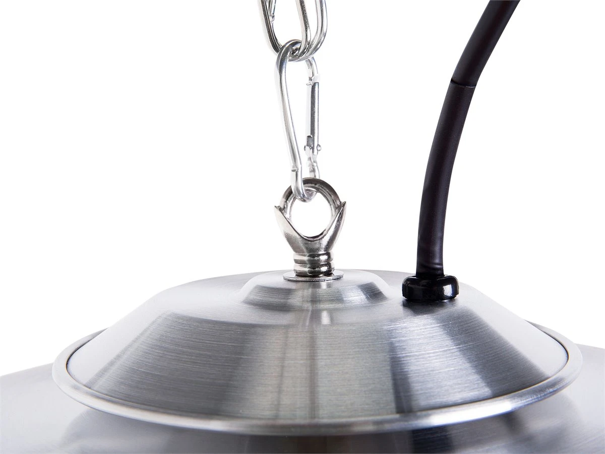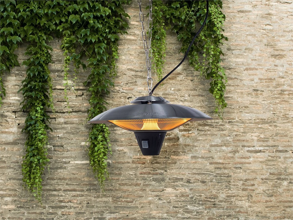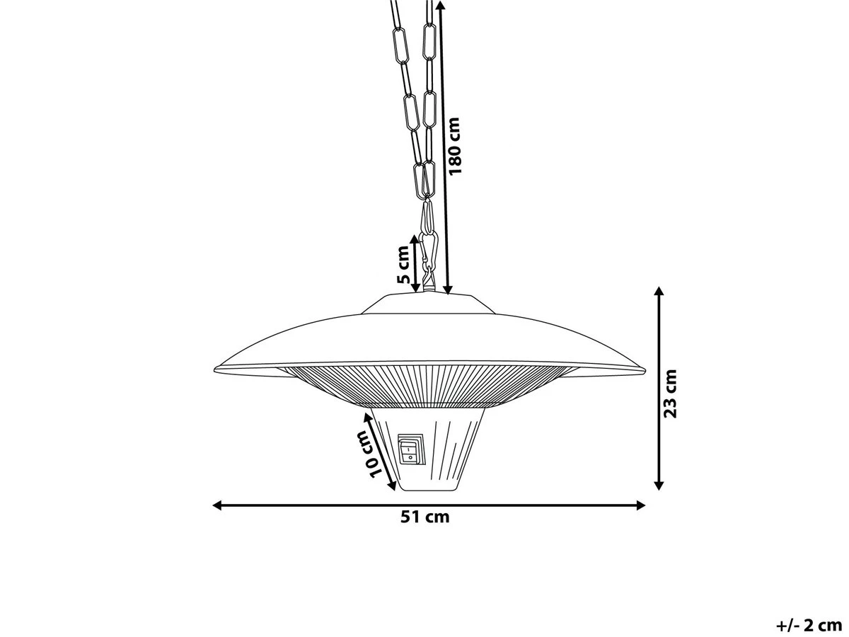 Calentador colgante para patio. El diseño moderno y la eficiencia se combinan en esta elegante estufa de jardín. Añade un poco de agradable calor a su espacio al aire libre de forma rápida. Para ubicar la estufa puedes sostenerla con el gancho en el techo o en algún otro lugar no accesible para los niños. El mecanismo de calefacción por infrarrojos propaga el calor de forma instantánea y da sensaciones similares a la exposición solar. Disfruta las noches frescas de verano al máximo, con la estufa de jardín eléctrica. Detalles: Tipo de Producto: Estufa de patio Color: Negro Tipo de material: Metal Material principal: Aluminio Material adicional: Acero Conexión / Terminal: 15 A Código de protección IP: IP 24 (antisalpicaduras Consumo de potencia: 1800 W Montaje: Colgante Dimensiones: Longitud del cable: 180 cm Profundidad: 51 cm Ancho: 51 cm Altura: 23 cm Peso: 3 kg La oferta incluye: 1 x Estufa de exterior Ventajas: Crea un ambiente acogedor, Brinda un toque acogedor a cualquier espacio, Alta calidad, Cumple con los estándares PAH, RoHS y SAA, Certificados GS, CE, CB Información de montaje: No requiere montaje Información adicional: La estufa requiere hasta 5 minutos para alcanzar su máxima potencia de calentamiento, Distancia mínima: 25 cm de la pared, 50 cm del techo, 180 cm del suelo, La distancia óptima de calentamiento es de 2 metros. Aunque se puede sentir el calor a mayor distancia, se recomienda colocar el dispositivo lo más cerca posible y así aprovechar al máximo su potencial. Consejos de mantenimiento: Aluminio: 1.Limpiar con un paño húmedo, 2.No meter en el agua 3.Antes de comenzar a limpiar, desconecta el enchufe. No toques la estufa cuando esté caliente o no se haya enfriado por completo.
