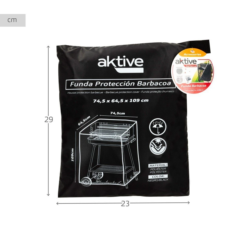 Funda para barbacoa color negro Aktive Barbecue. Mide 74,5×64,5×109 cm y está fabricada de poliéster, un material resistente y duradero, capaz de soportar la exposición a la intemperie sin desgastarse fácilmente. Además, el poliéster es un material resistente al agua, lo que ayuda a mantener la parrilla seca y libre de moho. La funda incorpora cuerda de sujeción que se ajusta a la barbacoa para evitar que se vuele en días de viento fuerte. Incluye una bolsa para guardar la funda mientras no se esté utilizando.