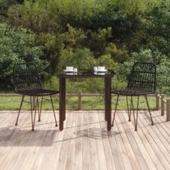 ¡Crea una estética atractiva y cohesionada en el espacio al aire libre de tu casa con este juego de comedor para jardín! Material duradero: El ratán PE, también conocido como ratán sintético, es resistente a la intemperie y fácil de limpiar. La parte exterior se mantiene hermosa durante mucho tiempo. Ofrece una gran calidad, comodidad y aspecto estético.Estructura resistente y estable: Las estructuras de acero hacen que el conjunto de patio sea resistente y estable para el uso diario al aire libre.Práctica superficie: La superficie lisa de la mesa de comedor está hecha de vidrio templado, fácil de limpiar con un paño húmedo. Además, la robusta superficie de la mesa es perfecto para colocar comidas, bebidas y otros elementos decorativos.Asientos cómodos: La silla de comedor está diseñada con un respaldo para ofrecer una experiencia de asiento cómoda.Prácticas almohadillas: El juego de muebles viene con tacos en las patas, para que se apoye en el suelo con firmeza. Nota:Para prolongar la vida de tus muebles de exterior, te recomendamos que los protejas con una funda impermeable.Cada producto viene con un manual de montaje en la caja para facilitar el montaje. Mesa:Color: NegroMaterial: Acero con recubrimiento en polvo, vidrio templadoDimensiones: 80 x 80 x 74 cm (largo x ancho x altoSilla:Color: NegroMaterial: Acero, polietileno con aspecto de ratánDimensiones: 48 x 62 x 84 cm (ancho x profundidad x altoDimensiones del asiento: 48 x 44 cm (ancho x profundoAltura del asiento: 47 cmLa entrega incluye:1 x Mesa2 x Sillas