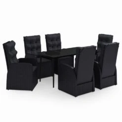 ¡Este elegante juego de comedor para jardín está destinado a ser el centro de atención del jardín o patio! ¡Es una opción genial para comer o relajarse al aire libre! Las estructuras de acero con recubrimiento en polvo hacen que la mesa y las sillas sean robustas y estables para usar a diario en exteriores. Gracias al ratán PE resistente al agua, las sillas son fáciles de limpiar y resistentes. El respaldo se reclina tirando del botón del lateral. Gracias a la construcción ligera, son fáciles de mover. Los cojines de asiento acolchados también dan un plus de comodidad. Las fundas de poliéster apernas necesitan cuidados y se pueden quitar para lavarlas. Asimismo, la lisa superficie de vidrio se limpia fácilmente con un paño húmedo y es perfecta para colocar comida, bebida y otros artículos decorativos. Nota: Para prolongar la vida de tus muebles de exterior, te recomendamos que los protejas con una funda impermeable. Color: NegroColor del cojín: NegroMaterial: Ratán PE, acero con recubrimiento en polvo, vidrioMaterial de la funda de cojín: 100% poliésterDimensiones: 140 x 70 x 74 cm (largo x ancho x altoDimensiones de la silla (no reclinada: 57 x 73 x 105 cm (ancho x profundo x altoDimensiones de la silla (reclinada: 57 x 127 x 97 cm (ancho x profundo x altoAncho del asiento: 47 cmProfundidad del asiento: 53 cmAltura del asiento desde el suelo: 41 cmAltura del reposabrazos desde el suelo: 63 cmGrosor del cojín: 4 cmRequiere montaje: SíLa entrega contiene:1 x Mesa6 x Sillas6 x Cojines de asiento6 x Cojines de respaldo
