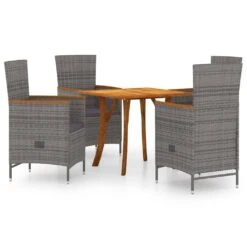 ¡Crea una estética atractiva y cohesionada en el espacio al aire libre de tu casa con este juego de comedor para jardín! Esta mesa de exterior está fabricada en madera maciza de acacia, lo que la hace robusta y estable. La superficie con acabado de aceite también facilita la limpieza de la mesa con un paño húmedo. Además, las patas curvas contribuyen a su elegante diseño. Con una estructura de ratán resistente a la intemperie, estas sillas de comedor son robustas y fáciles de limpiar. El respaldo se reclinará tirando del botón lateral. Cada asiento viene con un cojín acolchado grueso para agregar comodidad en su tiempo de descanso. Nota: Para prolongar la vida útil de los muebles de exterior, te recomendamos que los limpies con regularidad y no los dejes al aire libre sin protección innecesariamente.Limpieza: Usar una solución de jabón suaveAlmacenamiento: Si es posible, guarda el producto en un lugar fresco y seco en el interior. Si el producto se almacena al aire libre, protégelo con una funda impermeable. Limpia y seca el exceso de agua o nieve de las superficies planas después de una lluvia o nevada. Permite la ventilación para evitar daños relacionados con la humedad. Mesa:Material: Madera maciza de acacia con acabado de aceite Dimensiones: 85 x 85 x 75 cm (largo x ancho x altoGrosor de la superficie: 2 cmSilla:Color del ratán sintético: GrisColor del asiento: Gris oscuroMaterial: Ratán PE redondo, acero con recubrimiento en polvo, madera maciza de acacia, tela (100% poliésterDimensiones (silla no reclinada: 58 x 62 x 108 cm (ancho x profundo x altoDimensiones (silla reclinada: 58 x 90 x 91 cm (ancho x profundo x altoGrosor del cojín: 5 cmAnchura del asiento: 47 cmProfundidad del asiento: 47 cmAltura del asiento desde el suelo (sin cojín: 43 cmAltura del reposabrazos desde el suelo: 67 cmRequiere montaje: SíLa entrega incluye:1 x Mesa4 x Sillas4 x Cojines de asiento
