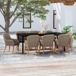¡Este elegante juego de comedor para jardín está destinado a ser el centro de atención del jardín o patio! ¡Es una opción genial para comer o relajarse al aire libre! Las estructuras de acero con recubrimiento en polvo hacen que la mesa y las sillas sean robustas y estables para usar a diario en exteriores. Gracias al ratán PE resistente al agua, las sillas son fáciles de limpiar y resistentes. La forma ergonómica y los cojines acolchados y extraíbles con relleno de espuma proporcionan el confort definitivo. Las fundas de poliéster apenas necesitan cuidados y se pueden quitar fácilmente para lavarlas. Asimismo, la lisa superficie de vidrio se limpia fácilmente con un paño húmedo y es perfecta para colocar comida, bebida y otros artículos decorativos. Nota: Para prolongar la vida de tus muebles de exterior, te recomendamos que los protejas con una funda impermeable. Color: Marrón y negroColor de cojín: Gris oscuroMaterial: Ratán sintético, acero con recubrimiento en polvo, madera maciza de acacia con acabado de aceite, vidrioMaterial de la funda de cojín: 100% poliésterDimensiones de la mesa: 200 x 100 x 74 cm (largo x ancho x altoDimensiones de la silla: 56 x 60 x 81,5 cm (ancho x profundo x altoAnchura del asiento: 41 cmProfundidad del asiento: 45 cmAltura del asiento desde el suelo: 41 cmAltura del reposabrazos desde el suelo: 61 cmGrosor del cojín: 3 cmRequiere montaje: SíLa entrega contiene:1 x Mesa8 x Silla8 x Cojines de asiento