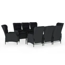 ¡Disfruta de una buena comida o cena en el espacio al aire libre de tu casa con este juego de comedor para jardín! Con un diseño elegante, ¡se convertirá en el centro de atención del jardín o patio! El práctico juego de comedor para exterior tiene una estructura de acero, por lo que es fuerte y robusto. Las sillas reclinables de jardín están hechas de ratán PE, resistente al agua y que no necesita mantenimiento, por lo que son perfectas para usar al aire libre. Los cojines acolchados dan un plus de comodidad a la hora de las comidas. La funda del cojín está equipada con una cremallera, es extraíble y lavable. Gracias al mecanismo de elevación a gas, el respaldo también se puede regular para que encuentres la mejor postura. Al tocar el botón del lateral, el respaldo se reclina para ofrecer una posición cómoda. Asimismo, la lisa superficie de vidrio se limpia fácilmente con un paño húmedo y es perfecta para colocar comida, bebida y otros artículos decorativos. Nota: Para prolongar la vida de tus muebles de exterior, te recomendamos que los protejas con una funda impermeable. Mesa:Color: NegroMaterial: Acero con recubrimiento en polvo, vidrioDimensiones: 200 x 100 x 74 cm (largo x ancho x altoSilla:Color de la silla: Gris oscuroColor del cojín: NegroMaterial de la silla: Ratán PE redondo, acero con recubrimiento en polvoMaterial del cojín: Funda 100% poliéster con relleno de espumaDimensiones de la silla (no reclinada: 57 x 88 x 100 cm (ancho x profundo x altoDimensiones de la silla (reclinada: 57 x 121 x 80 cm (ancho x profundo x altoAnchura del asiento: 50 cmProfundidad del asiento: 59 cmAltura del asiento desde el suelo: 39 cmAltura del reposabrazos desde el suelo: 60 cmGrosor del cojín del asiento: 6 cmGrosor del cojín de respaldo: 10 cmPosee función reclinableRequiere montaje: SíLa entrega contiene:1 x Mesa8 x Sillas8 x Cojines de asiento8 x Cojines de respaldo