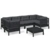 Este juego de muebles para jardín de madera está pensado para ser la opción ideal para relajarte y disfrutar del buen tiempo, echar una siesta o charlar con tu familia o amigos. Con un diseño de palets atemporal, el sofá de madera agregará un toque de encanto rústico a tu patio, jardín o sala de estar. Hecho de madera de pino maciza, este juego de muebles para jardín es muy duradero, resistente a la intemperie y respetuoso con el medio ambiente. Este conjunto de muebles tiene una construcción maciza y requiere poco mantenimiento. Además, el diseño modular también permite colocar el conjunto en cualquier disposición según tu gusto. Nota: Para prolongar la vida útil de los muebles de exterior, te recomendamos que los limpies con regularidad y no los dejes al aire libre sin protección innecesariamente.Limpieza: Usa una solución de jabón suave.Almacenamiento: Si es posible, guarda el producto en un lugar fresco y seco en el interior. Si el producto se almacena al aire libre, protégelo con una funda impermeable. Limpia y seca el exceso de agua o nieve de las superficies planas después de una lluvia o nevada. Permite la ventilación para evitar daños relacionados con la humedad. Color: NegroMaterial: Madera de pino macizaDimensiones del sofá de esquina/medio: 63,5 x 63,5 x 62,5 cm (ancho x profundo x altoDimensiones mesa/reposapiés: 63,5 x 63,5 x 28,5 cm (largo x ancho x altoRequiere montaje: SíLa entrega incluye:4 x Sofás de esquina5 x Sofás centrales1 x Mesa/reposapiés