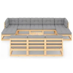 Este juego de salón de jardín es una opción ideal para relajarse y disfrutar del buen tiempo, echar una siesta o charlar con tu familia o amigos. El conjunto de sofás está fabricado en madera de pino maciza, lo que lo hace robusto y estable. Este conjunto tiene una construcción sólida y requiere poco mantenimiento. Los cojines añaden comodidad adicional. Este conjunto de muebles agregará un toque de encanto rústico a tu espacio exterior. Nota: Para prolongar la vida de tus muebles de exterior, te recomendamos que los protejas con una funda impermeable. Color del cojín: GrisMaterial: Madera maciza de pino, tela (100% poliésterDimensiones del sofá de esquina: 70 x 70 x 67 cm (ancho x profundo x altoDimensiones del sofá central: 70 x 70 x 67 cm (ancho x profundo x altoDimensiones mesa/reposapiés: 70 x 70 x 30 cm (ancho x profundo x altoDimensiones del cojín del asiento: 70 x 70 x 8 cm (largo x ancho x grosorDimensiones del cojín del respaldo: 70 x 40 x 8 cm (largo x ancho x grosorRequiere montaje: SíLa entrega contiene:2 x Sofás esquineros6 x Sofás centrales2 x Taburetes/reposapiés1 x Mesa10 x Cojines de asiento10 x Cojines traseros