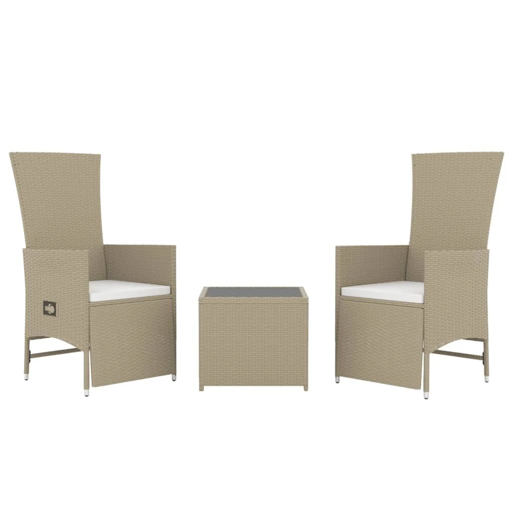 Este conjunto de muebles de exterior, con un diseño elegante y moderno, es una gran opción para relajarse en el jardín. Material duradero: El ratán PE, también conocido como ratán sintético, es resistente a la intemperie y fácil de limpiar. La parte exterior se mantiene hermosa durante mucho tiempo. Ofrece una gran calidad, comodidad y aspecto estético.Estructura estable: El acero es un material muy duro y fuerte. Ofrece solidez y estabilidad.Función reclinable: Las sillas de jardín de este conjunto de muebles de jardín están especialmente diseñadas con una función reclinable para que puedas ajustar el respaldo y el reposapiés según tu comodidad.Cómodo asiento: Con los cojines de asiento bien acolchados, las sillas resultan muy cómodas.Práctica superficie: La superficie de vidrio templado es perfecta para colocar o exponer tus cosas. Es bonita y fácil de limpiar. Nota:Para asegurarte de que tus muebles de exterior se mantengan hermosos, recomendamos protegerlos con una funda impermeable. Información útil:Para facilitar al máximo el montaje, cada producto se entrega con un manual. Silla de jardín:Color: BeigeMaterial: Ratán PE, aceroDimensiones sentado: 60 x 58 x 108 cm (ancho x profundo x altoDimensiones tumbado: 60 x 121 x 96 cm (ancho x profundo x altoDimensiones del asiento: 47 x 45 cm (ancho x profundoAltura del asiento desde el suelo: 43 cmAltura del reposabrazos desde el suelo: 65/62 cmMesa:Color: BeigeMaterial: Ratán PE, acero con recubrimiento en polvo, vidrio templadoDimensiones: 45 x 45 x 40 cm (ancho x profundo x altoCojín:Color: Blanco cremaMaterial de la cubierta: Tela (100% poliésterMaterial del relleno del cojín de asiento: EspumaGrosor del cojín del asiento: 4 cm La entrega incluye:2 x Sillas de jardín1 x Mesa2 x Cojines de asiento