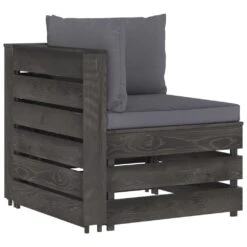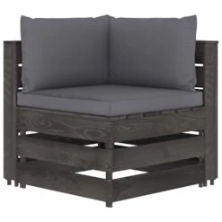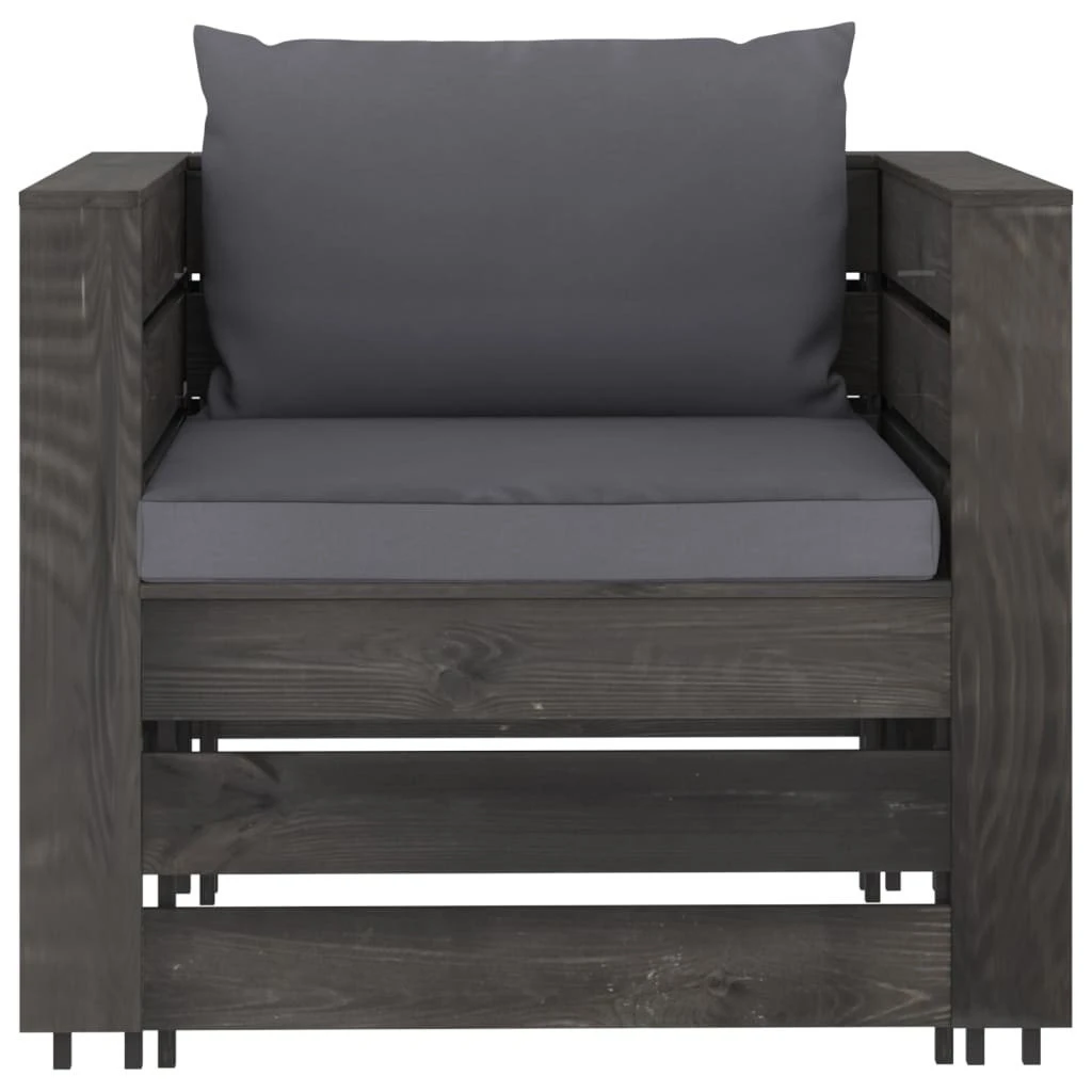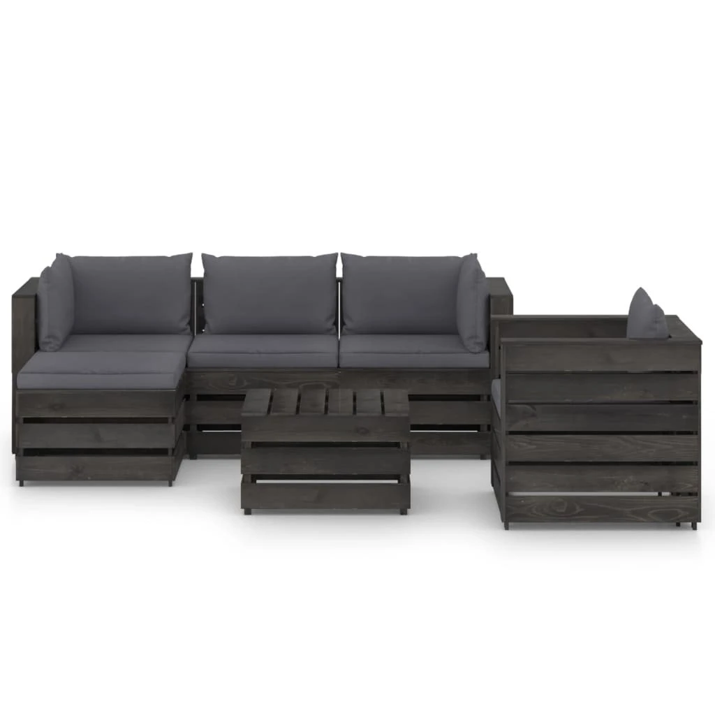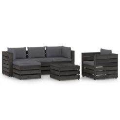Este juego de muebles para jardín está pensado para ser la opción ideal para relajarse y disfrutar del buen tiempo, echar una siesta o charlar con tu familia o amigos. Con un diseño de palés atemporal, el conjunto de sofás de madera añade un toque de encanto rústico a tu patio, jardín o sala de estar. Hecho de madera de pino impregnada, el juego de muebles de palés es duradero, resistente a la intemperie y respetuoso con el medio ambiente. Este set de sofás de exterior tiene una estructura maciza y requiere poco mantenimiento. Con cojines blandos y bien acolchados (no incluidos, el juego de sofás te brinda la máxima comodidad. Además, el diseño modular te permite colocar el conjunto de la forma que más te guste. Nota: Para prolongar la vida útil de los muebles de exterior, te recomendamos que los limpies con regularidad y no los dejes al aire libre sin protección innecesariamente.Limpieza: Usa una solución de jabón suave.Almacenamiento: Si es posible, guarda el producto en un lugar fresco y seco en el interior. Si el producto se almacena al aire libre, protégelo con una funda impermeable. Limpia y seca el exceso de agua o nieve de las superficies planas después de una lluvia o nevada. Permite la ventilación para evitar daños relacionados con la humedad. Color de cojín: Gris antracitaMaterial: Madera de pino impregnada de grisMaterial del cojín: Tela (100% poliésterDimensiones de sofá esquinero: 69 x 70 x 66 cm (ancho x profundo x altoDimensiones del sofá central: 60 x 70 x 66 cm (ancho x profundo x altoDimensiones de reposapiés/mesa: 60 x 62 x 37 cm (ancho x profundo x altoDimensiones del sofá individual: 77 x 70 x 66 cm (ancho x profundo x altoGrosor del cojín del asiento: 6 cmGrosor del cojín del respaldo/lateral: 13 cmRequiere montaje: SíLa entrega incluye:1 x Sofá central2 x Sofás de esquina2 x Reposapiés/mesas1 x Sillón5 x Cojines de asiento6 x Cojines de respaldo/laterales