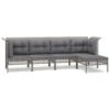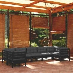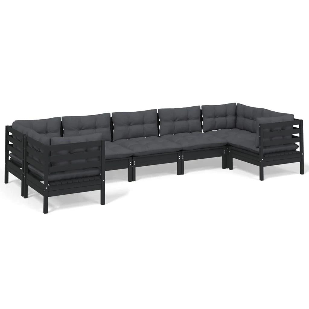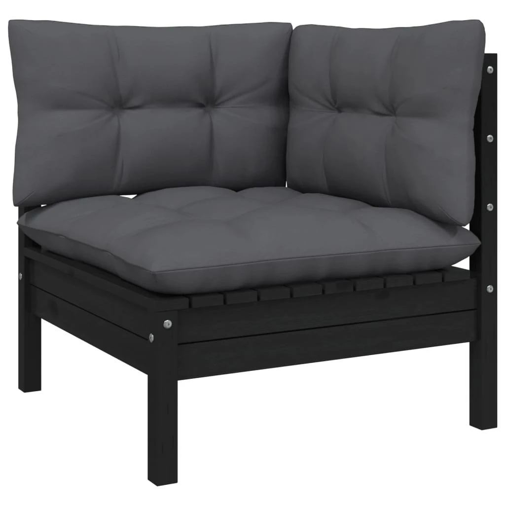 Este juego de muebles de jardín de madera es una excelente opción para relajarte y disfrutar del buen tiempo, echar una siesta o charlar con tu familia o amigos. El conjunto de muebles de jardín está hecho de madera maciza de pino, lo que lo hace robusto y estable. ¡Puedes combinarlo con otros segmentos modulares para crear tus propias configuraciones de set de salón de jardín personal! Nota: Para prolongar la vida útil de los muebles de exterior, te recomendamos que los limpies con regularidad y no los dejes al aire libre sin protección innecesariamente.Limpia: Usa una solución de jabón suaveAlmacenamiento: Si es posible, guárdalos en un lugar fresco y seco en el interior. Si el producto se almacena al aire libre, protégelo con una funda impermeable. Limpia y seca el exceso de agua o nieve de las superficies planas después de una lluvia o nevada. Permite la ventilación para evitar daños relacionados con la humedad. Color: NegroColor de cojín: Gris antracitaMaterial: Madera maciza de pino, tela (100% poliésterDimensiones del sofá de esquina/medio: 63,5 x 63,5 x 62,5 cm (ancho x profundo x altoDimensiones del cojín de asiento: 60 x 60 x 5 cm (largo x ancho x grosorDimensiones del cojín de respaldo/lateral: 60 x 32 x 5 cm (largo x ancho x grosorRequiere montaje: SíLa entrega incluye:4 x Sofás de esquina3 x Sofás centrales7 x Cojines de asiento11 x Cojines traseros/laterales
