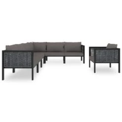 Disfruta de tu tiempo libre con nuestro elegante set de salón de poliratán. Este sofá viene con un diseño modular para múltiples opciones de reconfiguración. Se adapta perfectamente a tu terraza, jardín o patio. El conjunto de sofá de exterior está hecho de ratán sintético resistente a la intemperie. Es fácil de limpiar, duradero y adecuado para el uso diario. La estructura de aluminio con recubrimiento en polvo hace que el conjunto sea muy resistente y fuerte. Gracias a la construcción ligera, el conjunto de muebles de patio es fácil de mover. Puedes combinarlos libremente como quieras. Además, los cojines de asiento acolchados y las almohadas traseras proporcionan la máxima comodidad. Nota: Se recomienda cubrir el set en caso de lluvia, nieve y heladas. Color: Gris antracita, negroColor del asiento: Gris oscuroMaterial: Ratán sintético, aluminio, tela (100% poliésterDimensiones generales: 264 x 200 x 64 cm (ancho x profundo x altoDimensiones del sillón: 72 x 68 x 64 cm (ancho x profundo x altoDimensiones del sofá de esquina: 68 x 68 x 64 cm (ancho x profundo x altoDimensiones del sofá central: 64 x 68 x 64 cm (ancho x profundo x altoAltura del asiento: 32 cmGrosor del cojín: 8 cmGrosor de almohadas: 12 cmRequiere montaje: SíLa entrega incluye:1 x Sillón3 x Sofás de esquina3 x Sofás centrales7 x Cojines de asiento7 x Almohada de espalda grande (forma de almohada lumbar1 x Cojines de respaldo pequeños (forma de almohada lumbar