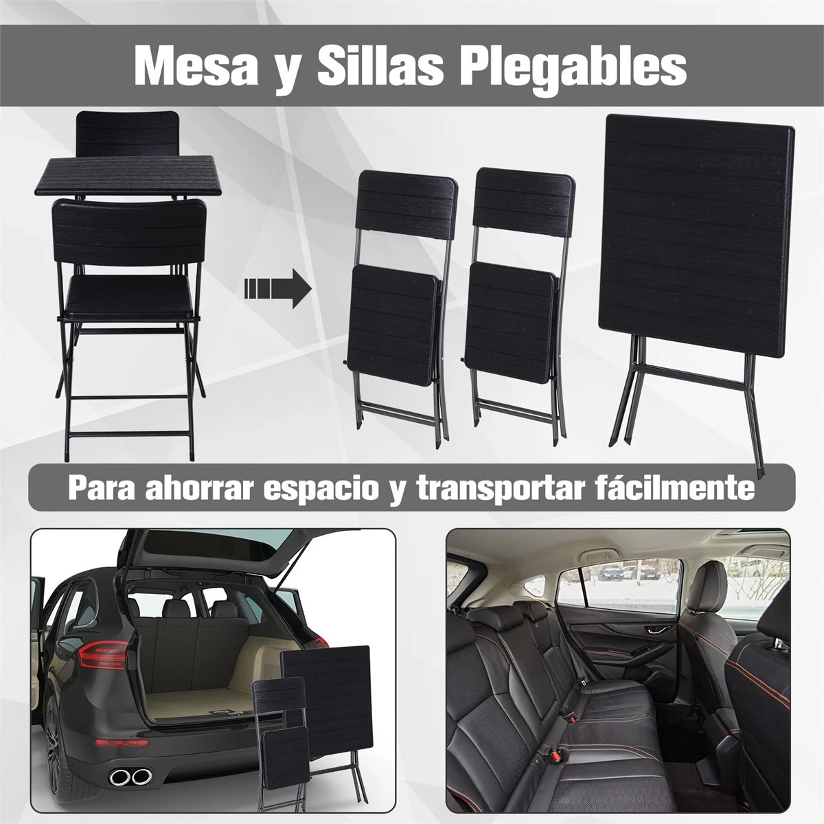 - – CONJUNTO DE MESA Y DOS SILLAS PLEGABLES DE EXTERIOR: Perfectas para sacar el máximo partido a tu balcón creando un agradable comedor de exterior. – PLEGABLES: Cuando no se utilizan, se pueden plegar y apartar a un rincón del balcón. Dejando libre todo el espacio. – COMPACTAS: Son muebles con medidas reducidas, pero que ofrecen comodidad. Tienen las medidas justas para estar cómodos, pero no ocupar demasiado. – FÁCIL DE LIMPIAR: Simplemente pásales un paño húmedo. – MEDIDAS: Mesa 61,6×61,6×74 cm (LxANxAL. Silla: 54×44,5×81 cm (LxANxAL. No requiere montaje.