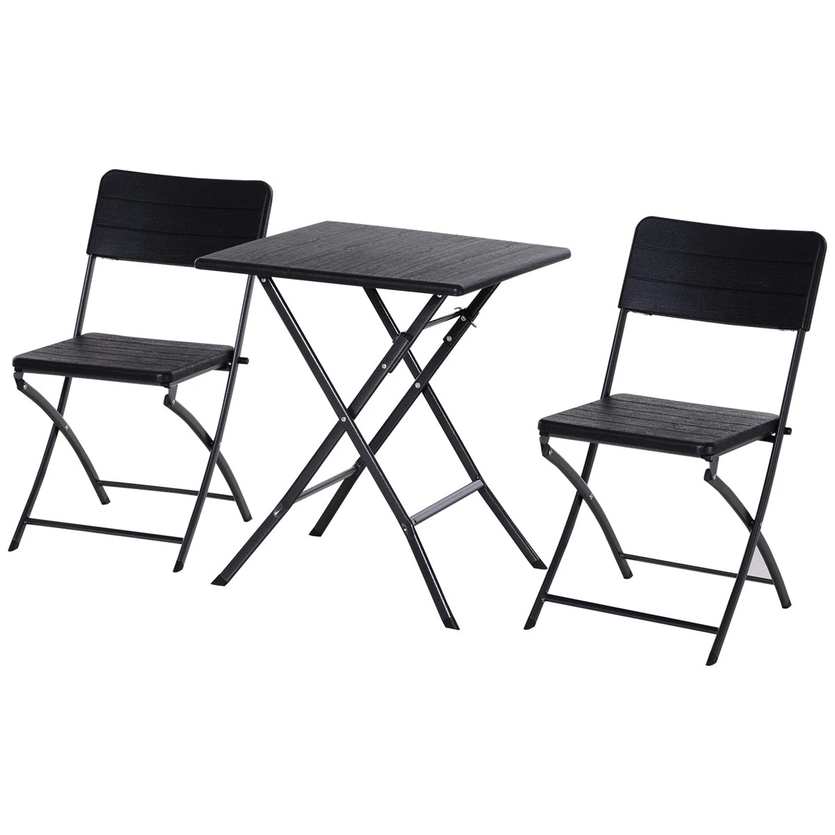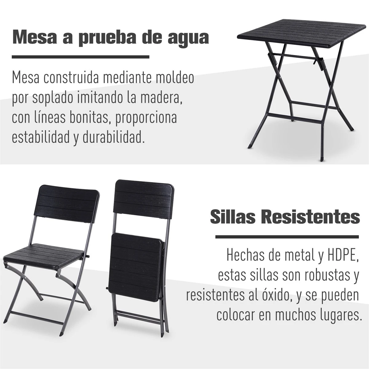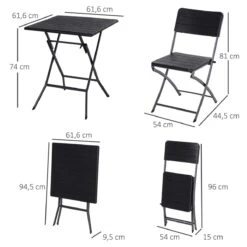 ¿Patio aburrido? Ilumina tu patio trasero con conjunto de mesa y 2 sillas plegables de exterior de Outsunny y haz que el exterior de tu hogar sea acogedor. A menudo, debido a los asientos incómodos o simplemente a la falta de muebles, muchos ambientes al aire libre se desperdician o se ignoran por completo. Dale vida a tu espacio exterior con una pequeña inversión. Decorativo y funcional, nuestro conjunto de mesa y 2 sillas plegables de exterior crea un ambiente acogedor que querrás usar durante todo el año. Características – Conjunto de mesa y dos sillas plegables perfecto para sacar el máximo partido a tu balcón – Fabricado con metal y HDPE para mayor poder utilizar en exteriores – Este juego de muebles de jardín se limpia muy fácilmente con un paño húmedo – El diseño plegable permite un fácil transporte o almacenaje – No requiere montaje Especificaciones – Color: negro – Material: metal, HDPE – Medidas totales de la mesa: 61,6×61,6×74 cm (LxANxAL – Medidas de la silla: 54×44,5×81 cm (LxANxAL – Medidas del asiento: 39x40x43 cm (LxANxAL – Medidas plegadas de la mesa: 94,5×61,6×9,5 cm (LxANxAL – Medidas plegadas de las sillas: 96x54x15 cm (LxANxAL – Pesos máximos de carga: (mesa 50 kg, (cada silla 110 kg – Referencia: 84B-375