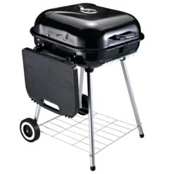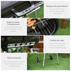 - – PARRILLA PORTÁTIL: Barbacoa portátil esmaltada en porcelana, resiste temperaturas de hasta 600℃. Muy resistente y duradera. Perfecta para acampadas, picnics y reuniones con familiares y amigos al aire libre. Podéis disfrutar de una deliciosa comida asada. – CONTROL DEL CALOR: La tapa incorpora un cierre para tener un mayor control de la temperatura. Además la parte superior de la tapa también incorpora unos orificios para permitir la entrada de aire sin necesidad de abrirla. Cuenta con una rejilla adicional más apartada del fuego, ideal para mantener los alimentos calientes. – FÁCIL DE USAR Y TRANSPORTAR: La parrilla de grado alimenticio es resistente a la oxidación y segura, y tiene una amplia superficie para la cocción de alimentos. El asa de la tapa es de material aislante para evitar posibles quemaduras y poder abrir y cerrar con facilidad. Consta de un asa en el lateral y dos ruedas para que puedas moverla con facilidad – BANDEJAS ADICIONALES: Cuenta con una bandeja lateral en la cual puedes poner los alimentos ante de cocinarlos o dejar el aceite o las pinzas. Cuando no la uses la puedes plegar y así ahorrar espacio. La parte inferior cuenta con otra bandeja para guardar utensilios u otros objetos necesarios. – MEDIDAS TOTALES: Con/sin estantes: 89x60x83 cm (LxANxAL / 62x60x82 cm (LxANxAL. Peso máximo soportado: 5 Kg. Requiere fácil montaje