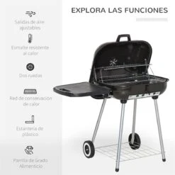¿Deseando hacer una barbacoa al aire libre? Con esta parrilla de carbón de Outsunny no tendrás que esperar más. Es perfecta para jardín, terraza o campings. Diseño versátil y funcional. La parrilla tiene la altura adecuada. Cuenta con dos estantes, uno en la parte inferior y otro en el lateral. Además cuenta con una rejilla adicional encima de la de cocción perfecta para mantener los alimentos calientes. Incorpora dos ruedas y un asa para que la puedas mover con total comodidad.