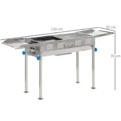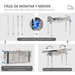- – BARBACOA ESPACIOSA: Esta barbacoa de carbón está equipada con una zona de parrilla de 66,5×30 cm, dos parrillas de malla y una plancha para cocinar diferentes alimentos. Con 2 estantes laterales que te permiten colocar condimentos, platos, utensilios, etc. – ALTURA DE LA PARRILLA REGULABLE: Regula la altura de la zona de cocción para adaptar la parrilla de carbón a las necesidades de cada cocinero. Para cocinar siempre cómodamente. La parrilla de grado alimenticio es resistente a la oxidación y segura para la cocción de alimentos – PORTÁTIL Y FÁCIL DE MONTAR: Esta BBQ es ideal para llevar a todas partes gracias a su portabilidad y diseño compacto. Fácil de montar gracias a los 4 tornillos con perilla, con estantes plegables y patas desmontables. Llévatela de camping, en tus acampadas o en tu jardín si no quieres una fija – ESTRUCTURA RESISTENTE: Barbacoa portátil de acero inoxidable y parrilla esmaltada para mayor resistencia a las altas temperaturas que se generan. Equipada con un depósito para el carbón, para que no tenga contacto directo con el fondo y así prolongar la vida útil del aparato – MEDIDAS TOTALES: 120x31x60-70 cm (LxANxAL. Medidas de los estantes laterales: 30,5×26 cm (LxAN. Carga máxima de cada estante: 5 kg