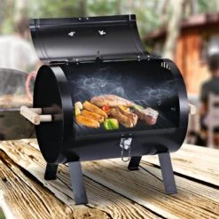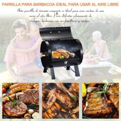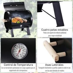 - – BARBACOA DE CARBÓN: Barbacoa de tamaño reducido y compacto ideal para usar sobre una mesa o superficie completamente plana al aire libre, como fiestas, campamentos, picnics y más – ASAS DE MADERA: Cuenta con 3 asas de madera, 2 en los laterales y otra en la tapa, para evitar quemaduras en las manos durante su uso, manejo o al transportarlas – PATAS Y CIERRE DE SEGURIDAD: Esta barbacoa está diseñada para colocarse sobre una mes o superficie y cuenta con 4 patas estables para ello. Tiene una tapa con cierre, para mayor seguridad al transportarla – TERMÓMETRO Y VENTILACIONES: Hecha de metal con tratamiento de electroforesis para garantizar su resistencia a altas temperaturas, cuenta con ventilaciones laterales para una mejor circulación del aire y un termómetro en la tapa para controlar la temperatura – MEDIDAS TOTALES: 50x35x39 cm (LxANxAL; Medidas del cuerpo principal: Ø40×30 cm (DiámxAL; Medidas de la parrilla: 29×19 cm (LxAN