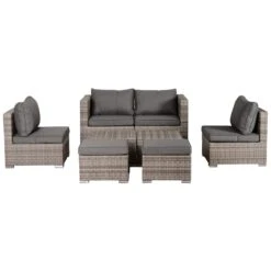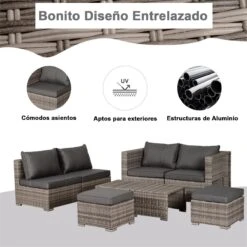 Con este conjunto convertible de sofás de ratán con mesa de centro y reposapiés de Outsunny podrás crear un espacio de relax exterior súper elegante tanto en terrazas como en jardines. Resulta muy práctico porque sus piezas encajan unas en otras, así que cuando no lo utilices te ocupará la mitad de espacio. No te lo pienses más, acabas de encontrar el conjunto convertible de sofás de ratán con mesa de centro y reposapiés ¡ideal! Características – Conjunto de jardín de 8 piezas (2 sillones esquineros que se pueden convertir en sofá, 2 sillones individuales, 2 reposapiés y 2 mesitas auxiliares – Ideal para terrazas, jardines y más – Cuando no lo utilices ahorra espacio encajando sus piezas unas dentro de otras – Fabricado con materiales de calidad aptos para estar en el exterior – Asientos y respaldos acolchados – Fundas con cremalleras fáciles de lavar – Con almohadillas antideslizantes – No requiere montaje – Los muebles vienen es dos cajas de un tamaño de 77x77x73cm Especificaciones – Color del Ratán: Diferentes tonos de gris – Color de las fundas de cojín: Gris – Material: Ratán, Acero, Tela, Esponja – Medida de los sillones de esquina: 75x75x71 cm (LxANxAL – Medidas del asiento: 65x65cm (LxAN – Sillones individuales: 71x68x67 cm (LxANxAL – Tamaño del asiento: 68×61 cm (LxAN – Distancia del asiento desde el suelo: 33cm – Medidas de la mesa de centro: 55x55x36 cm (LxANxAL – Tamaño del reposapiés: 52x48x30 cm (LxANxAL – Soporta 160kg/por asiento, 70kg (la mesa – Referencia: 860-099