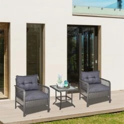 ¿Estás buscando un bonito y elegante conjunto de muebles de exterior? Este conjunto de 3 piezas de Outsunny compuesto por dos sillones y una mesa de centro es ideal. Con estructura de metal y mimbre de ratán PE, son resistentes a la intemperie y combinarán con elegancia en cualquier espacio exterior, sea una terraza, jardín, etc. Los sillones vienen con cojines para mayor comodidad. La encimera de la mesa es de vidrio templado con ligero relieve ondulado que recuerda a los movimientos del mar.