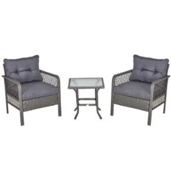 - – CONJUNTO DE MUEBLES DE EXTERIOR: Este juego de muebles para exterior está compuesto por 2 sillones y 1 mesa. Quedará perfecto en tu jardín, terraza, patio o cualquier espacio exterior – ESTRUCTURA DE METAL Y RATÁN: Hecho de metal resistente con recubrimiento y ratán PE, este conjunto se caracteriza por su gran resistencia a la intemperie, al agua y los rayos UV – ASIENTO CÓMODO: Los dos sillones de este conjunto cuentan con cojines en el asiento y respaldo, garantizando la máxima comodidad para ti y tus familiares o amigos. Los cojines cuentan con fundas desenfundables con cremallera para facilitar su lavado – MESA DE VIDRIO TEMPLADO: Mesa fácil de limpiar, con encimera de vidrio templado con grabado ondulado que recuerda al movimiento del mar. Incluye barra de refuerzo en las patas para mayor estabilidad – MEDIDAS TOTALES: silla 65x66x75 cm (LxANxAL y mesa 50x50x50 cm (LxANxAL; Medidas del asiento: 54×54 cm (LxAN; Carga máxima: 160 kg (silla y 50 kg (mesa